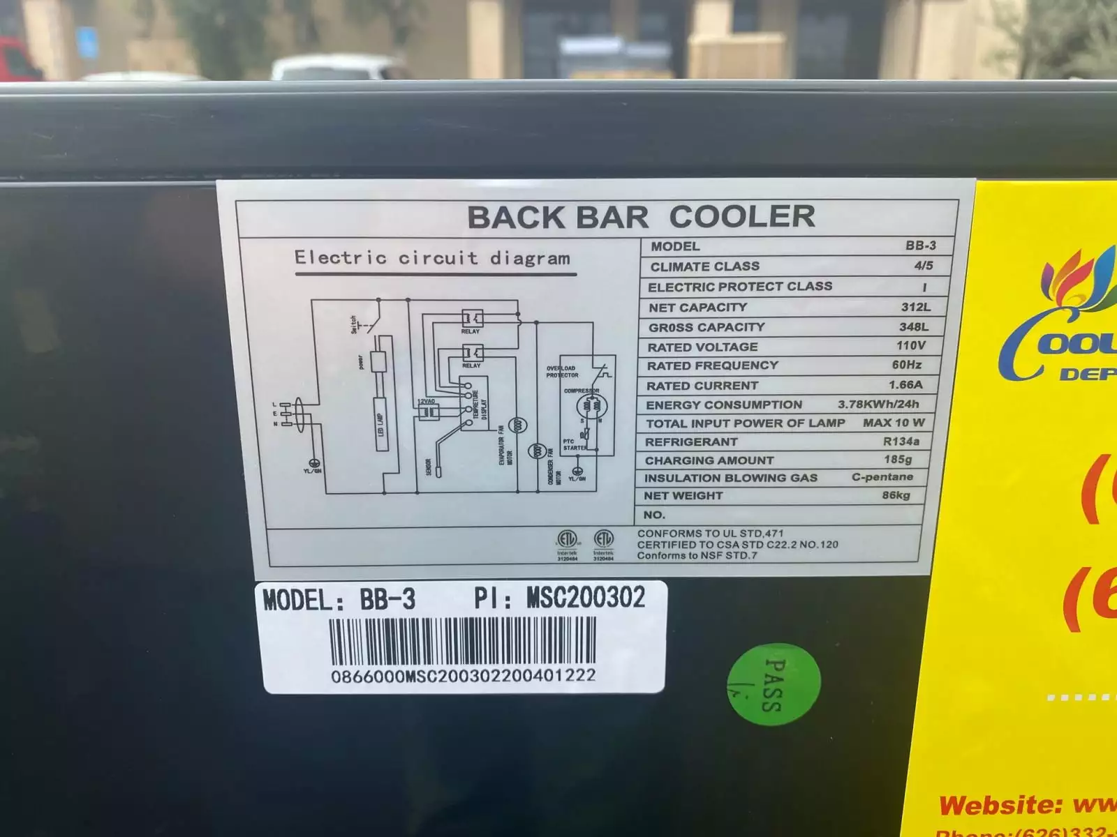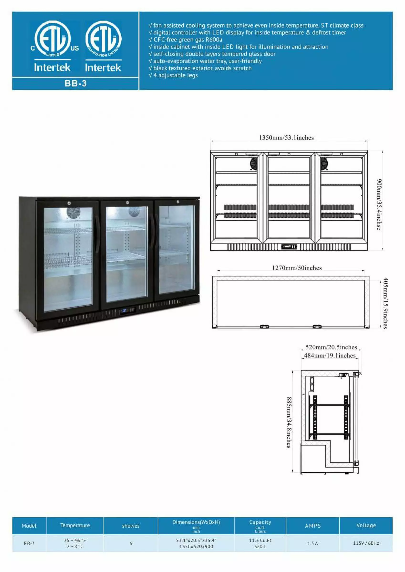 Model :BBT-350L Door type: swing door (hinged) dimension: 1350x520x900 (mm) material :prepainted steel net capacity: 320L cooling system:fan cooling temperature range: 0-8 shelves number: 6 interior light: LED light compresor : Zanussi digital thermostat:Dixell gross weight: 172 lbs kind of coolant: R134a/R600a