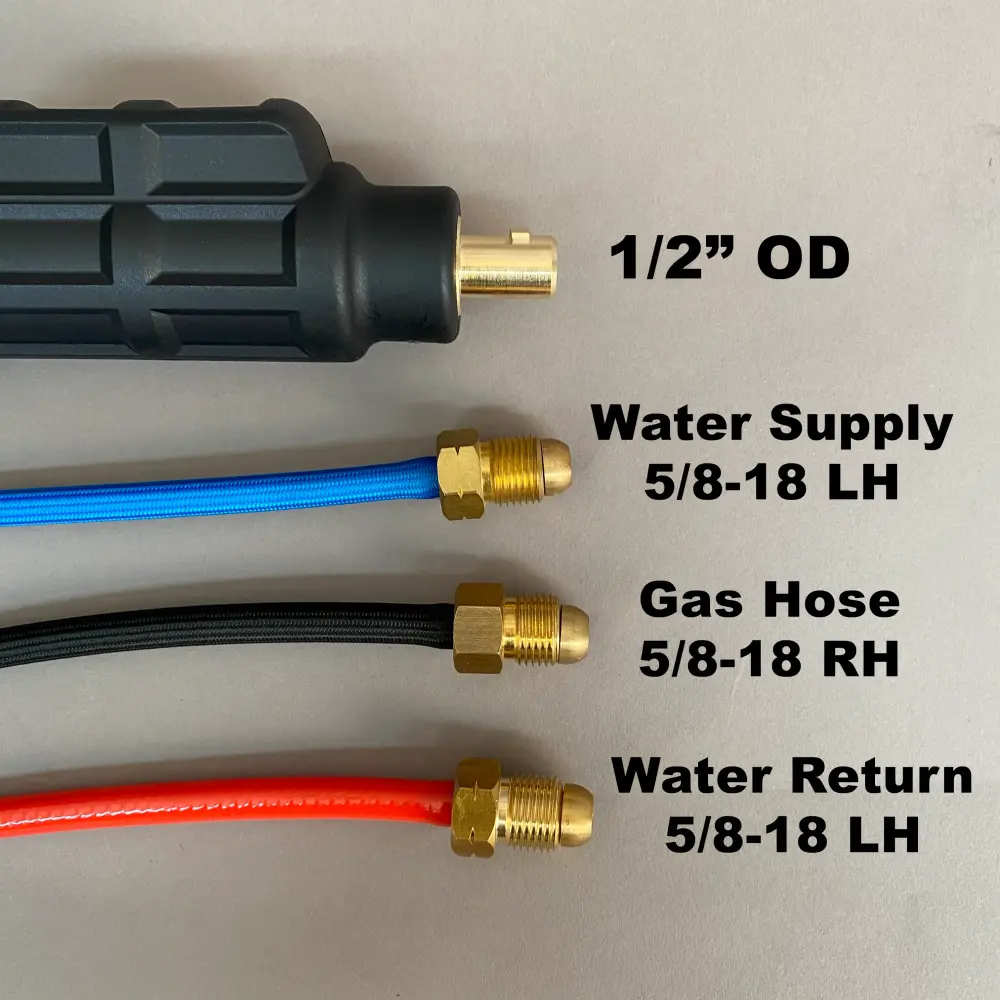 230 Series (300A) water-cooled TIG welding torch. Includes a 35 Dinse (1/2″) power connection, 5/8″-18 LH water-in and water-out fittings, and a 5/8″-18 RH gas fitting. Also includes a zippered Nylon outer cable cover, a tool-less connection torch head, and super-flexible, color-coded cables.