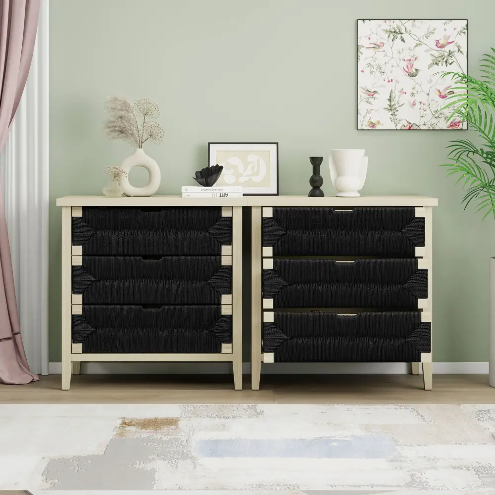 - Stylish Handle-Free Design: Drawer fronts feature a pinewood frame with hand-woven rope for a natural, modern look without traditional handles.