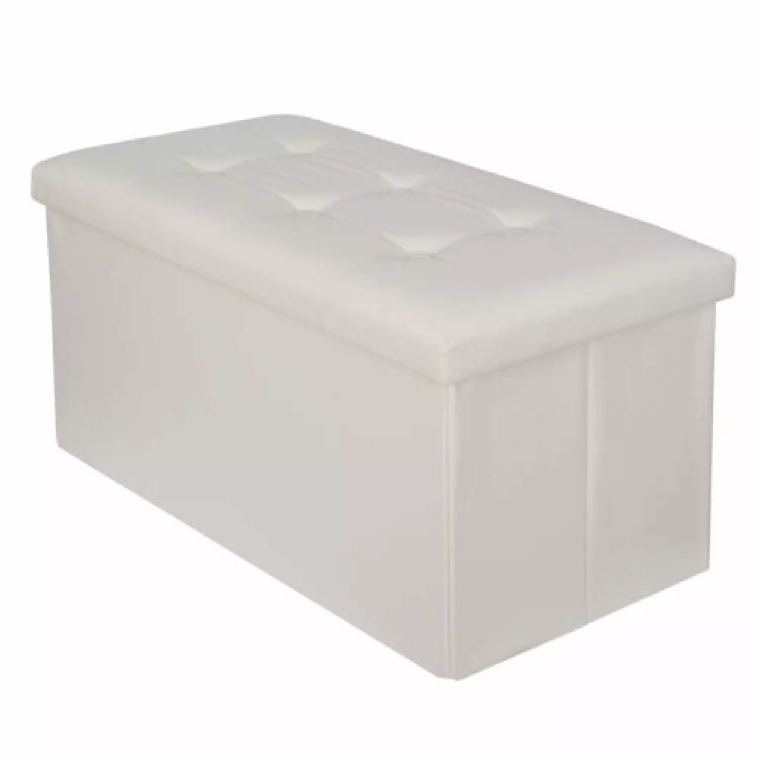 Features: Sturdy and Durable: The storage bench is made of solid MDF. which makes it stable and durable to use. it can hold up to 350lbs. It will meet your needs properly. Large Storage Space: This foldable bench has a large storage space. It can tore all of your child’s toys in this versatile wood toy chest. And it is useful to collecte stuffed animals. books. games. art & craft supplies. linens. pillows. blankets. clothes. shoes. seasonal items. s. and more in the home or office. It is easy to install and in perfext size. Easy to Assemble: This foldable ottoman is very easy to assemble. you just need to unfold it and close the top board. You can finish it by yourself within a few minutes. Versatile Storgae Furniture: The ottoman can be used as a storage tools or a foot stool. and it is suiable for kid’s room. nursery. front hallway. family room. laundry area. closet. storage room. Specifications:Material: Polyester. MDF. Non-woven fabrics. Pvc.LeatherColor: BeigeOverall size:29.9 x 14.8 x 14.6"Capacity: 350lbs Replacement and Refund PolicyPlease contact our customer service team immediately if you need a replacement and need to request a refund:1. You changed your mind and wish to request a replacement or a refund2. Your product was damaged during transit