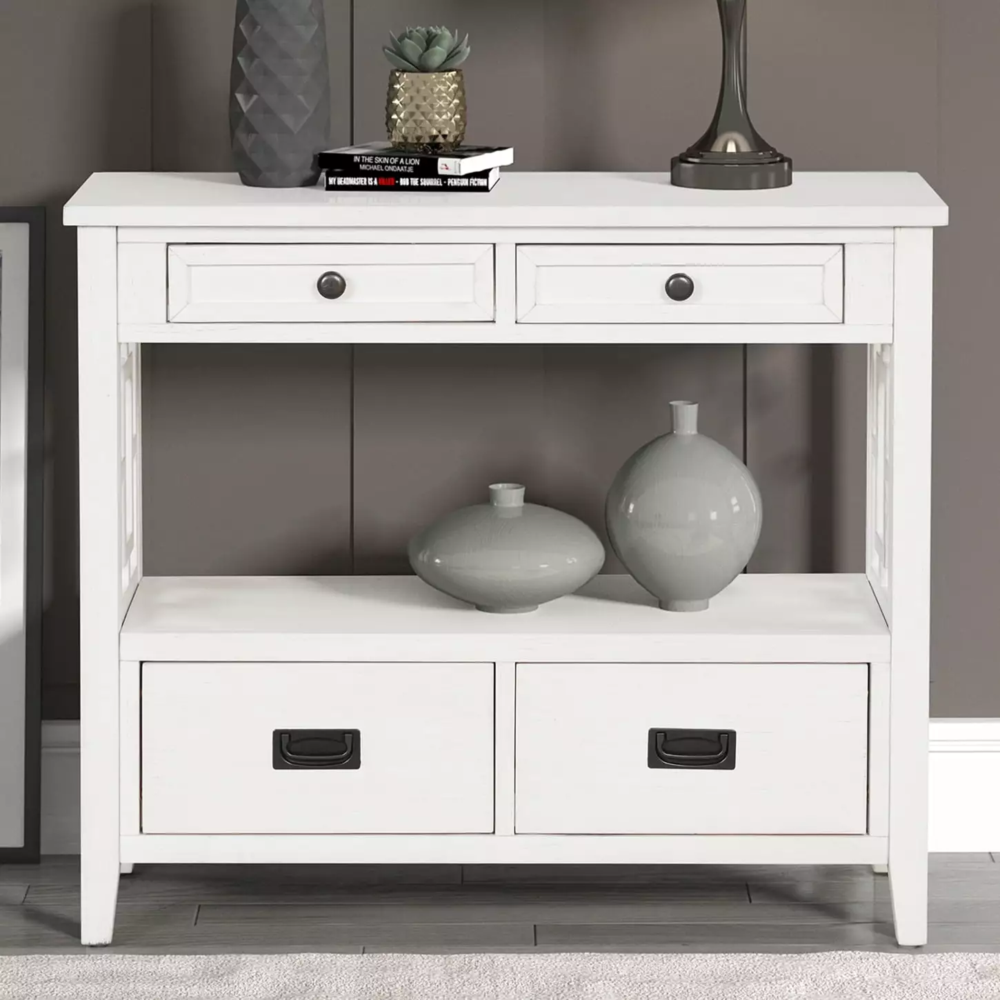 Spacious Storage: With four large drawers. one open shelf. and a spacious tabletop. this table offers versatile storage options. Use the drawers to organize your files. daily essentials. and sundries. The open shelf can hold decorative items. baskets. or books. while the tabletop is perfect for displaying vases. photos. decorations. or a lamp.