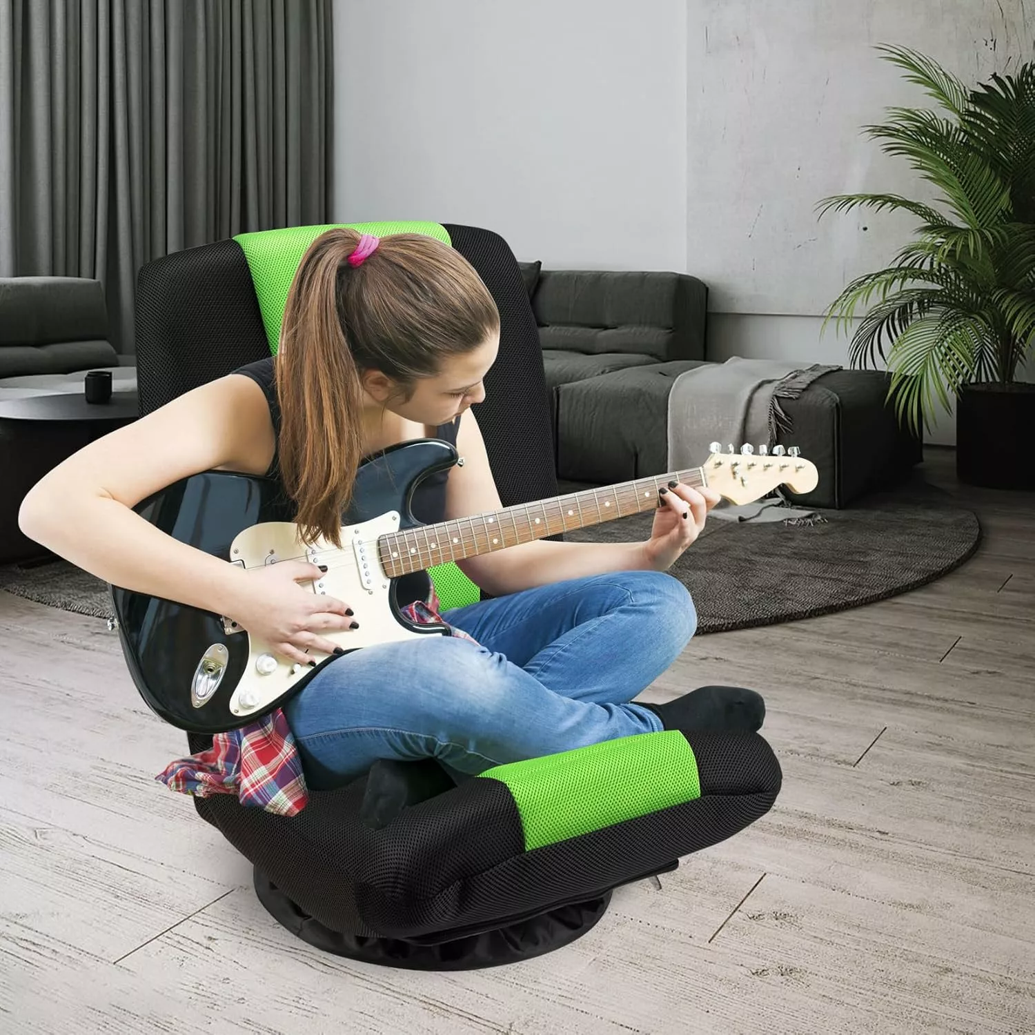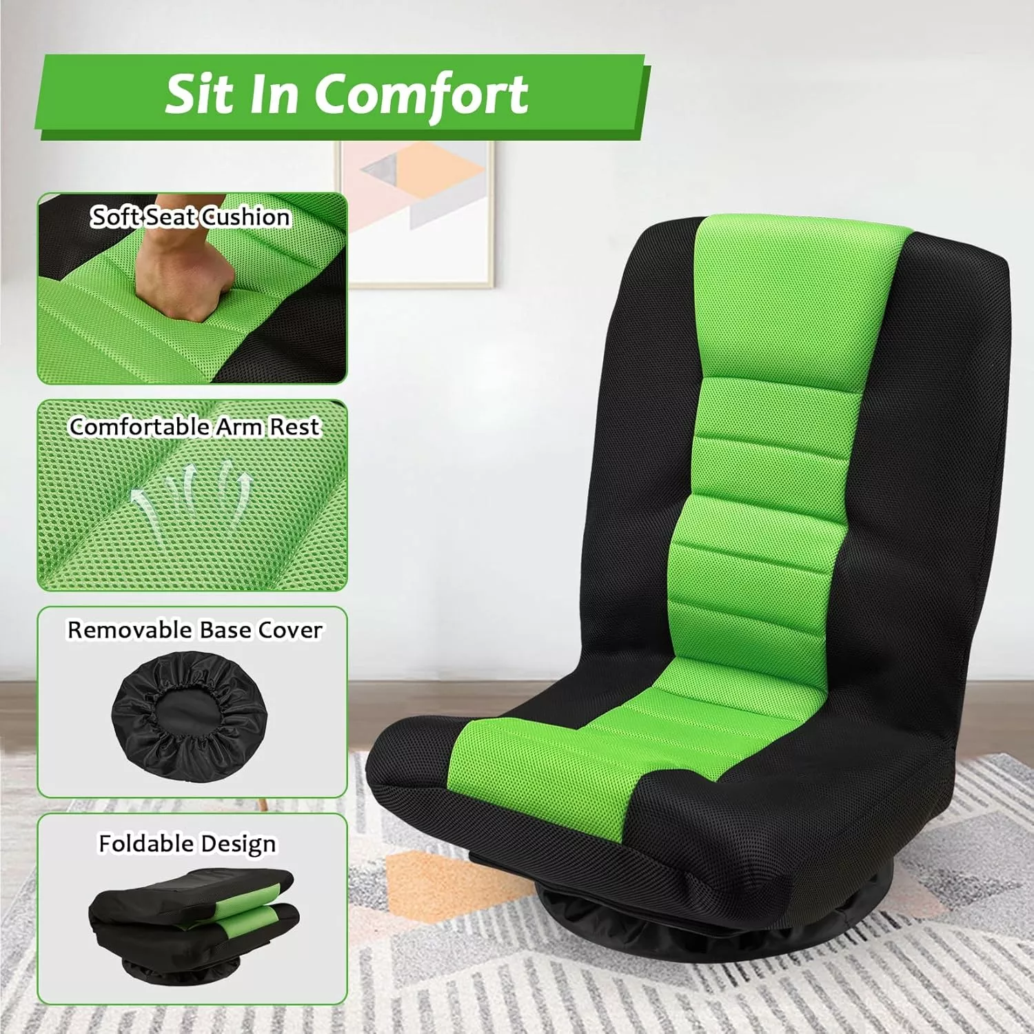 - **360-degree Swivel Base**The floor chair is equipped with a 360** degree swivel base. which can bring much convenience to change your sitting posture and get something within reach. According to your preference. you can adjust the chair to any direction. And the gaming chair equipped with a removable and washable base cover. which can protect the floor from being scratched.
