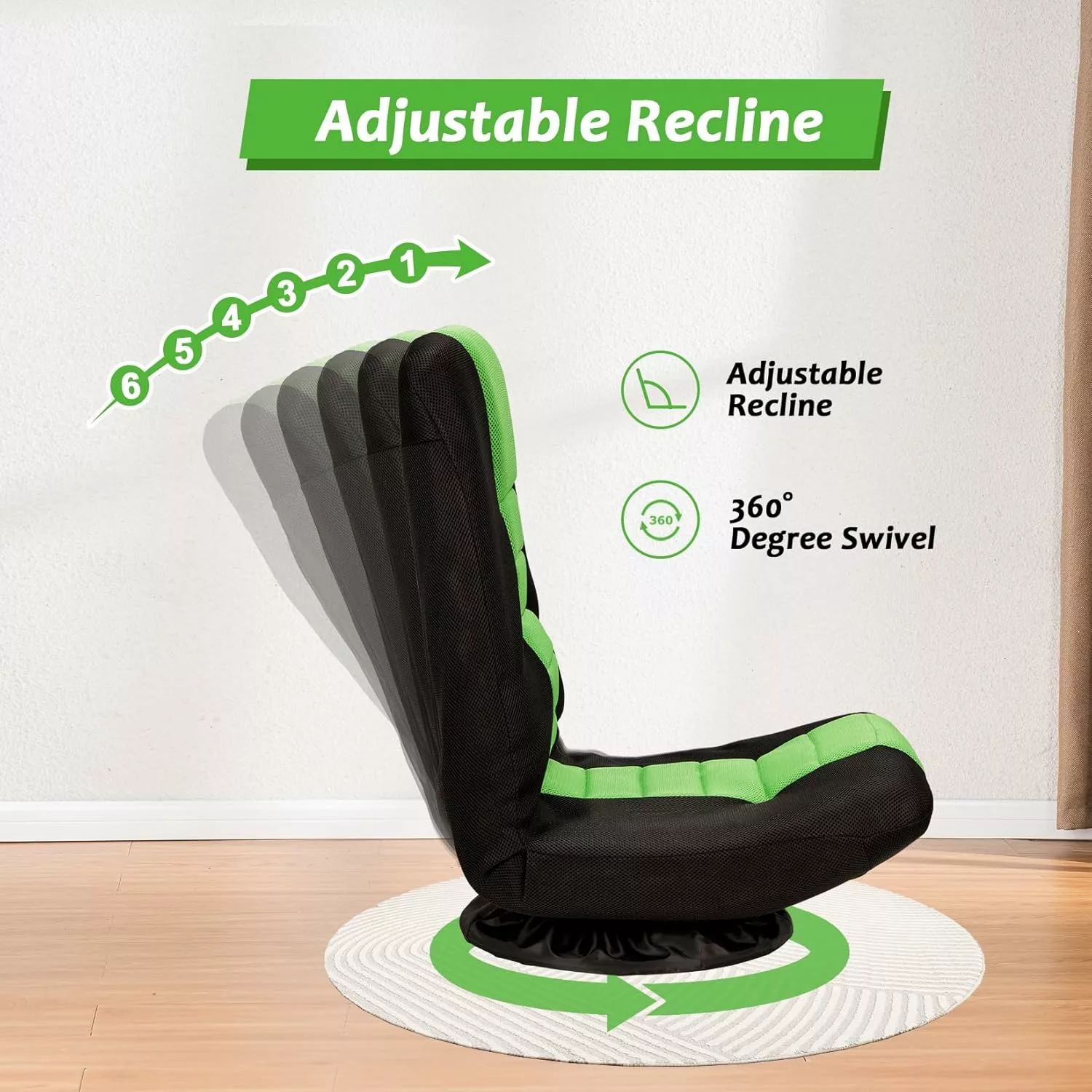 **360-degree Swivel Base**The floor chair is equipped with a 360** degree swivel base. which can bring much convenience to change your sitting posture and get something within reach. According to your preference. you can adjust the chair to any direction. And the gaming chair equipped with a removable and washable base cover. which can protect the floor from being scratched.