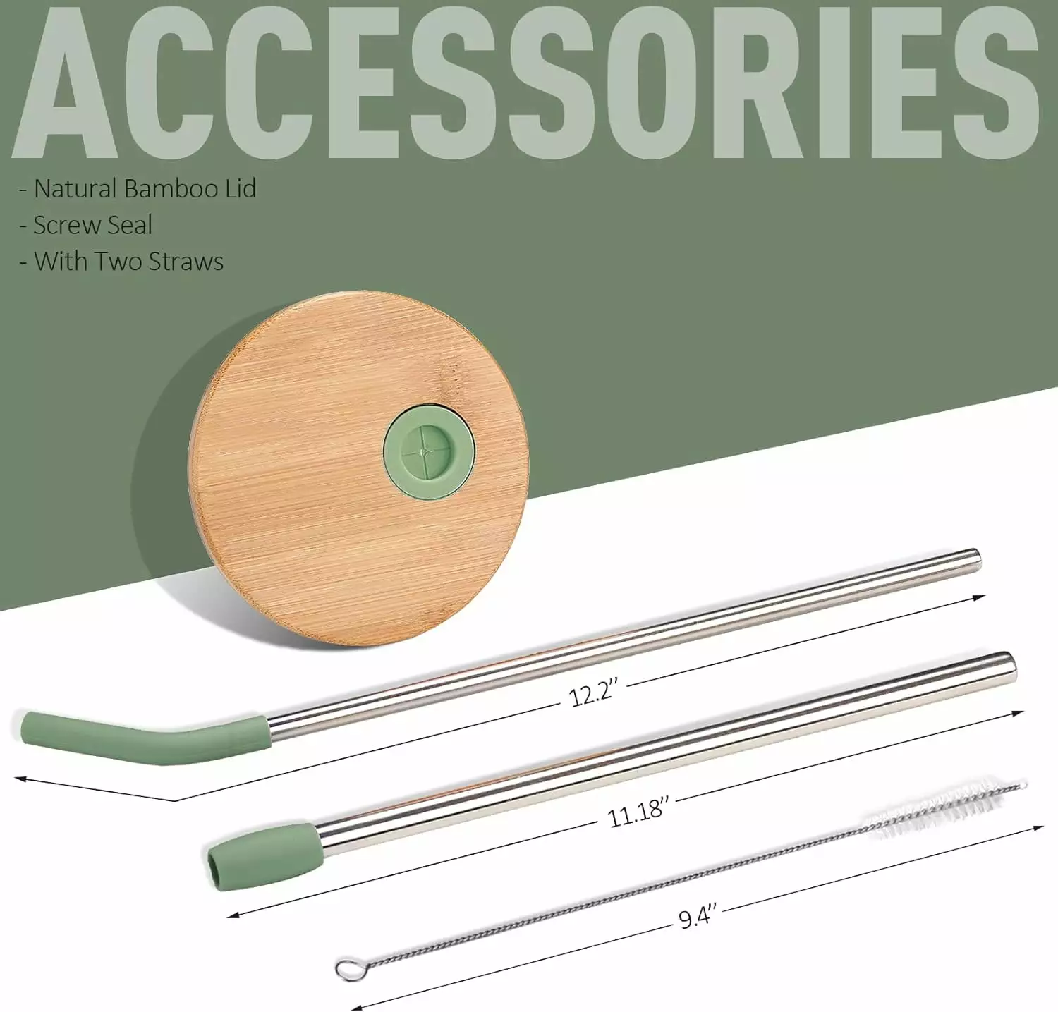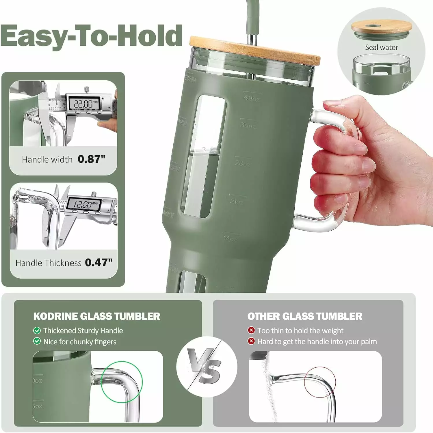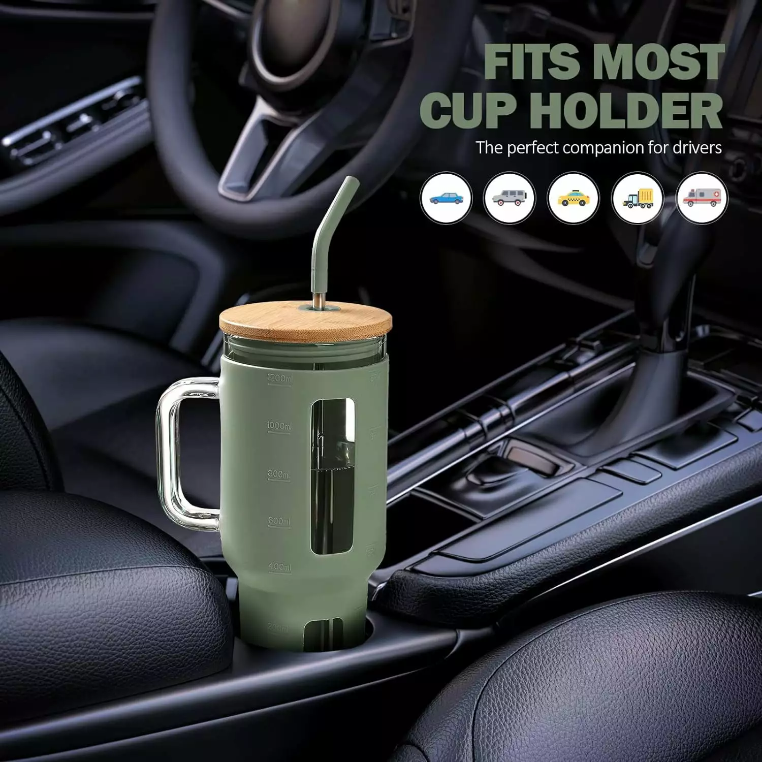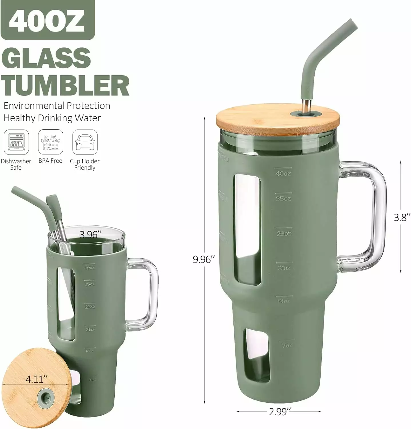 40 oz Glass Tumbler with Handle – Car Cup Holder Compatible – Silicone Sleeve with Time Marker & Ounce Marker – Includes Bamboo Lid and Stainless Steel Straw