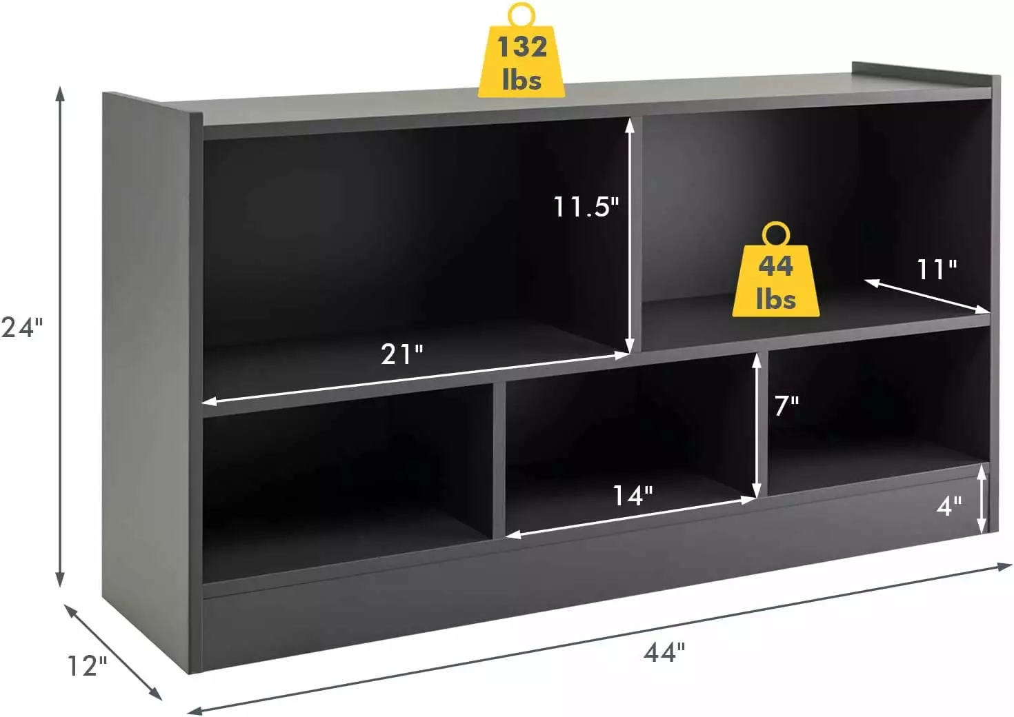 - Stable ConstructionMade of sturdy selected E0 engineered boards. this 2-tier 5-cube storage bookcase is safe and durable. The thickened bottom layer. reinforced back buckles and non-slip pads make the structure more stable. The top can hold up to 132 lbs and each cube can hold up to 44 lbs. Besides. the smooth corner will not cause any potential injury.