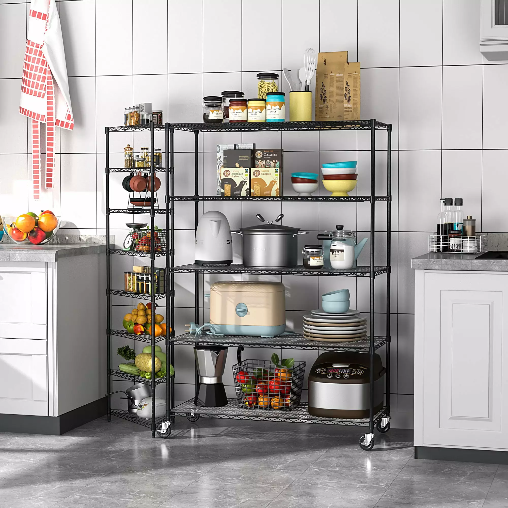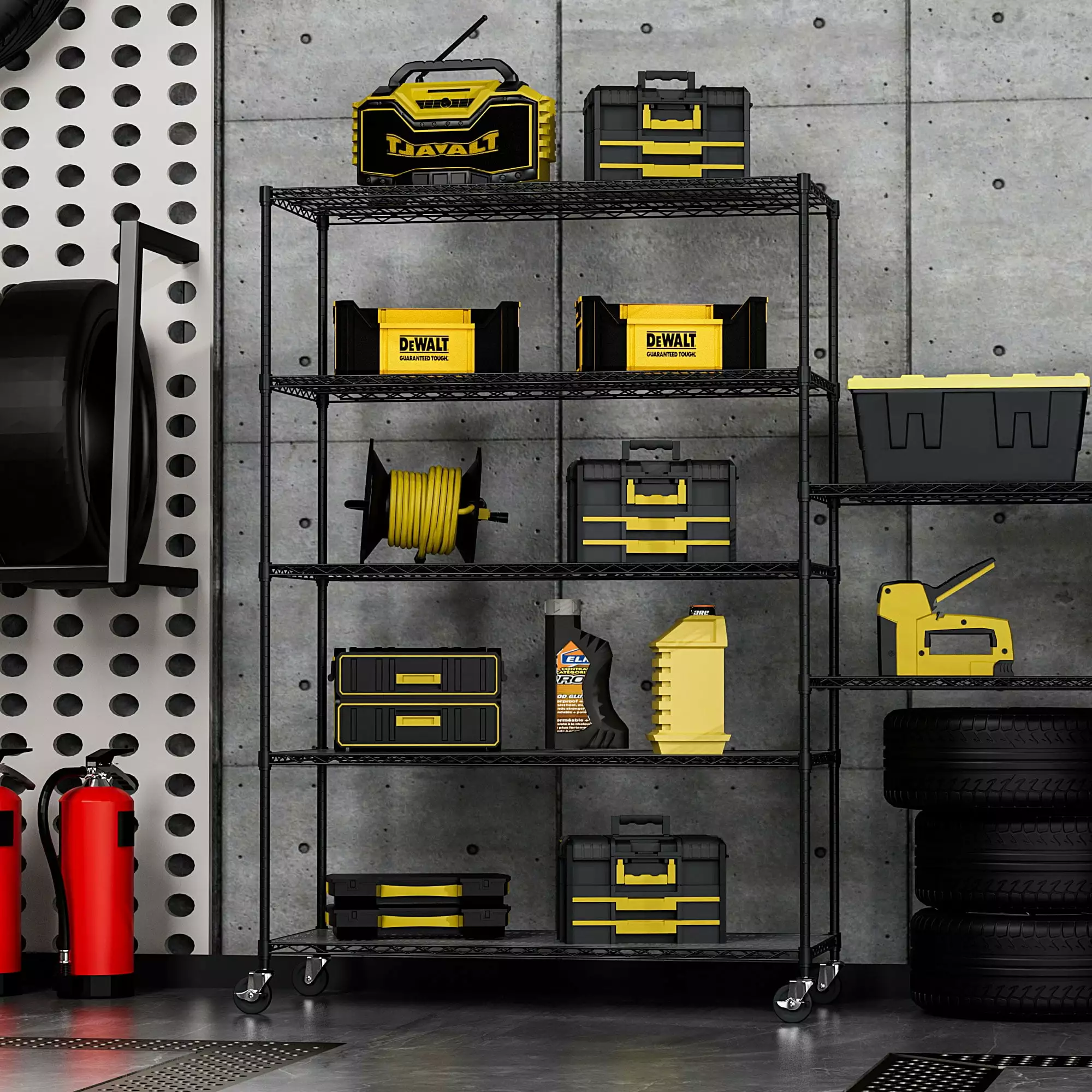 - [ADJUSTABLE DESIG] – Each shelf can adjustable in 1-inch increments. adjust the shelf height according to size of the item. meet your different needs. get the best utility shelf. Create two new shelf by splitting the top pole. you can split it according to your actual needs and achieve multiple uses. [EASY MOVEMENT] – 5 tier garage shelves have 4 leveling feet. 4 4-inch industrial wheels(2 lockable).