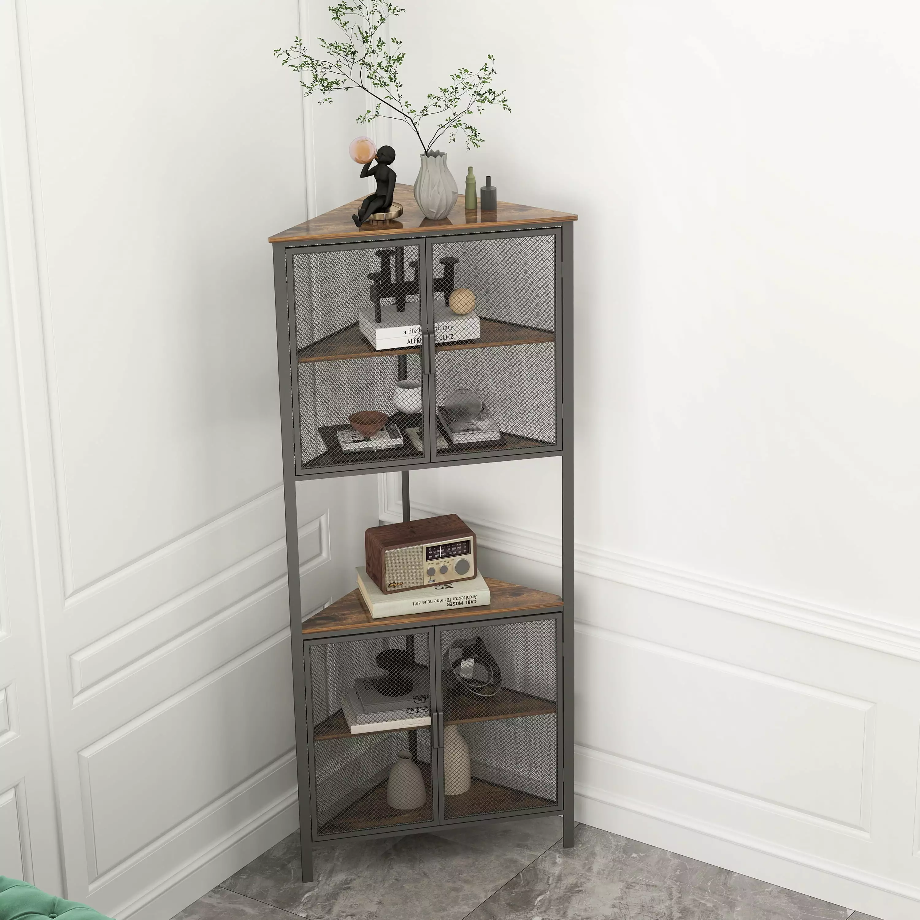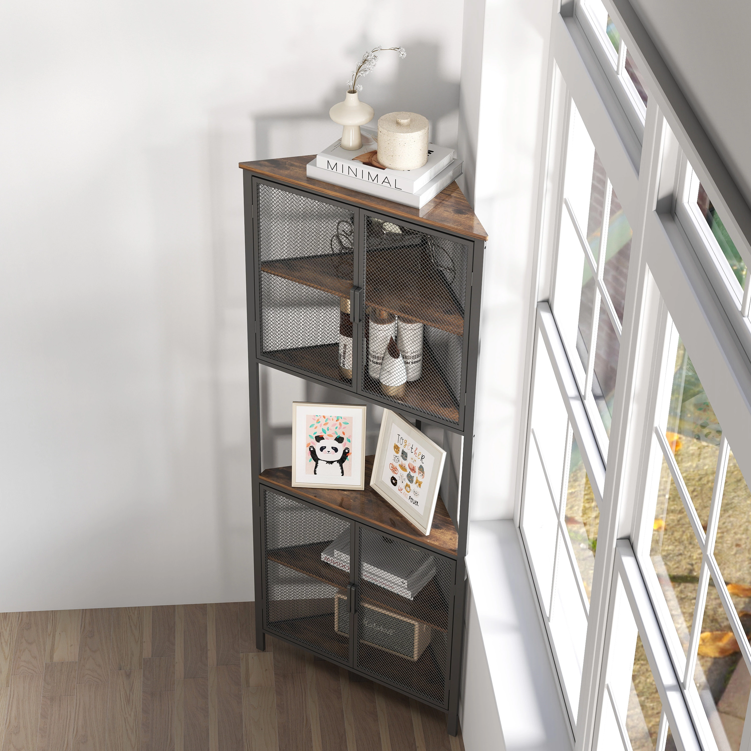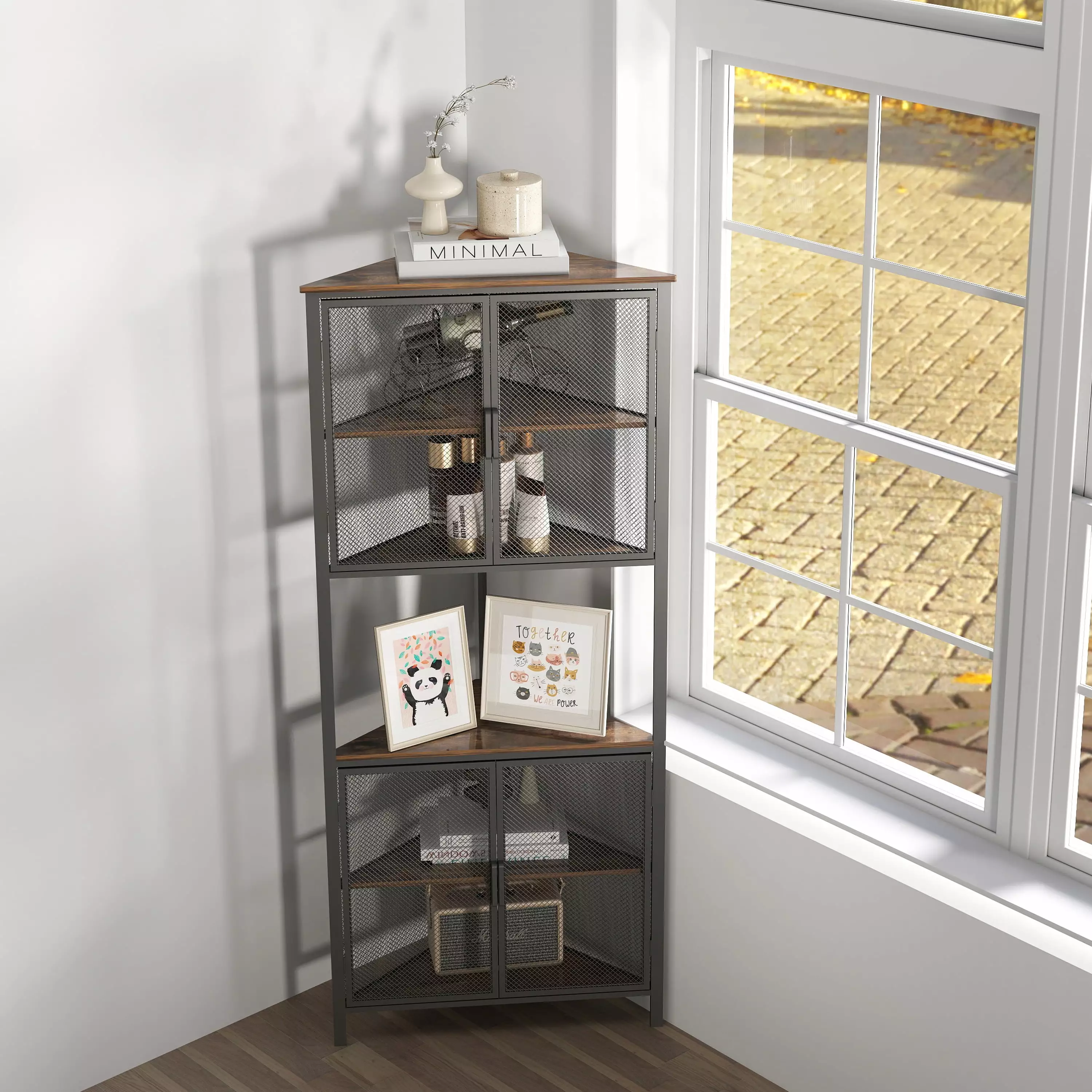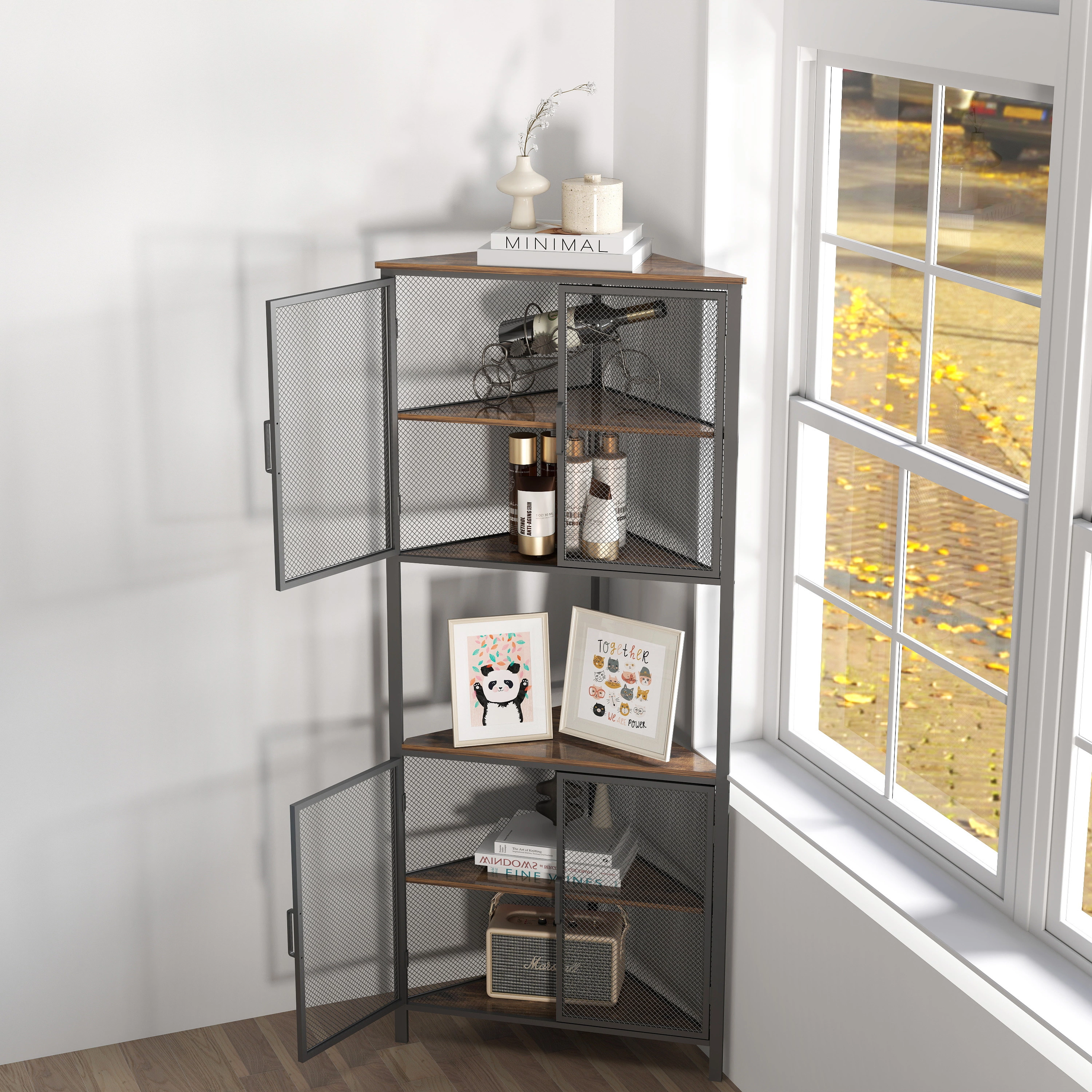 - The five-tier shelves feature a metal mesh door design. stylish and minimalist. with a unique charm. Compact corner design maximizes small space utilization. providing ample storage space.