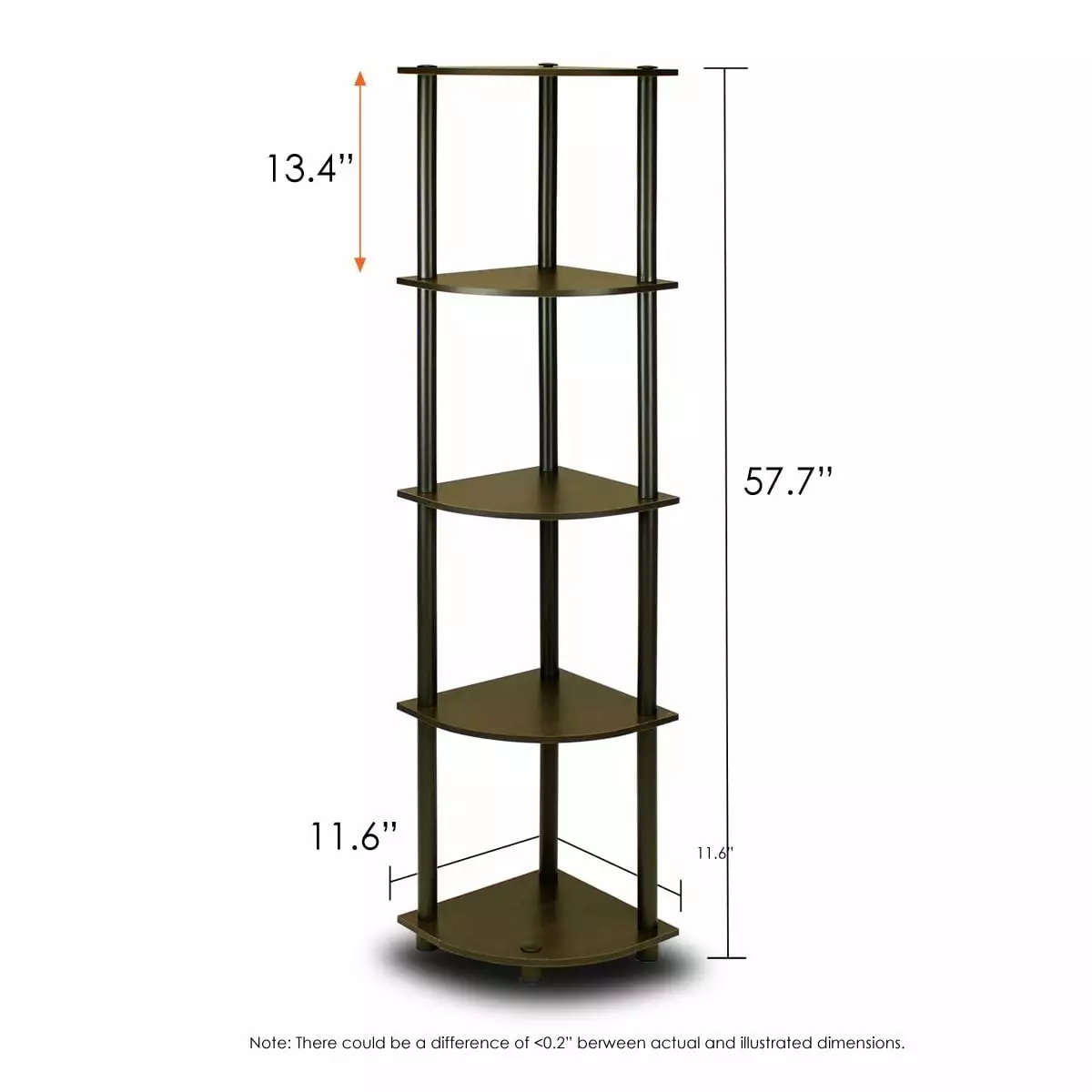 Features: This 5-Tier Corner Display Shelf Bookcase in Espresso & Black is designed to meet the demand of low cost but durable and efficient furniture. It is proven to be the most popular furniture due to its functionality. price. and the no hassle assembly. The materials comply with e1 grade particle board for furniture. There is no foul smell of chemicals. durable and it is the most stable particleboard used to make furniture. Care instructions: wipe clean with clean damped cloth. Avoid using harsh chemicals. We are pleased to send you the replacement part free of charge. Pictures are for illustration purpose. All decor items are not included in this offer. Pictures are for illustration purpose. All decor items are not included in this offer. Specifications: 5-Tier Corner Display Shelf Bookcase in Espresso & Black Simple stylish design yet functional and suitable for any room Material: engineered e1 particleboard made from recycled materials. durable highly processed recycled plastic tube Great storage unit for bathroom. closet. home office. living room. kids room. kitchen. etc Sturdy on flat surface and no hassle 5-minutes assembly 11.6 x 11.6 x 57.7 inches Weight: 8.8lbs. Package Contents: 1 x 5-Tier Corner Display Shelf Bookcase in Espresso & Black PROP65 Warning: This product contains a chemical known to the State of California to cause cancer. *Decorations and accessories are not included. *Images shown are only a representation and may vary.5-Tier Corner Display Shelf Bookcase in Espresso & Black