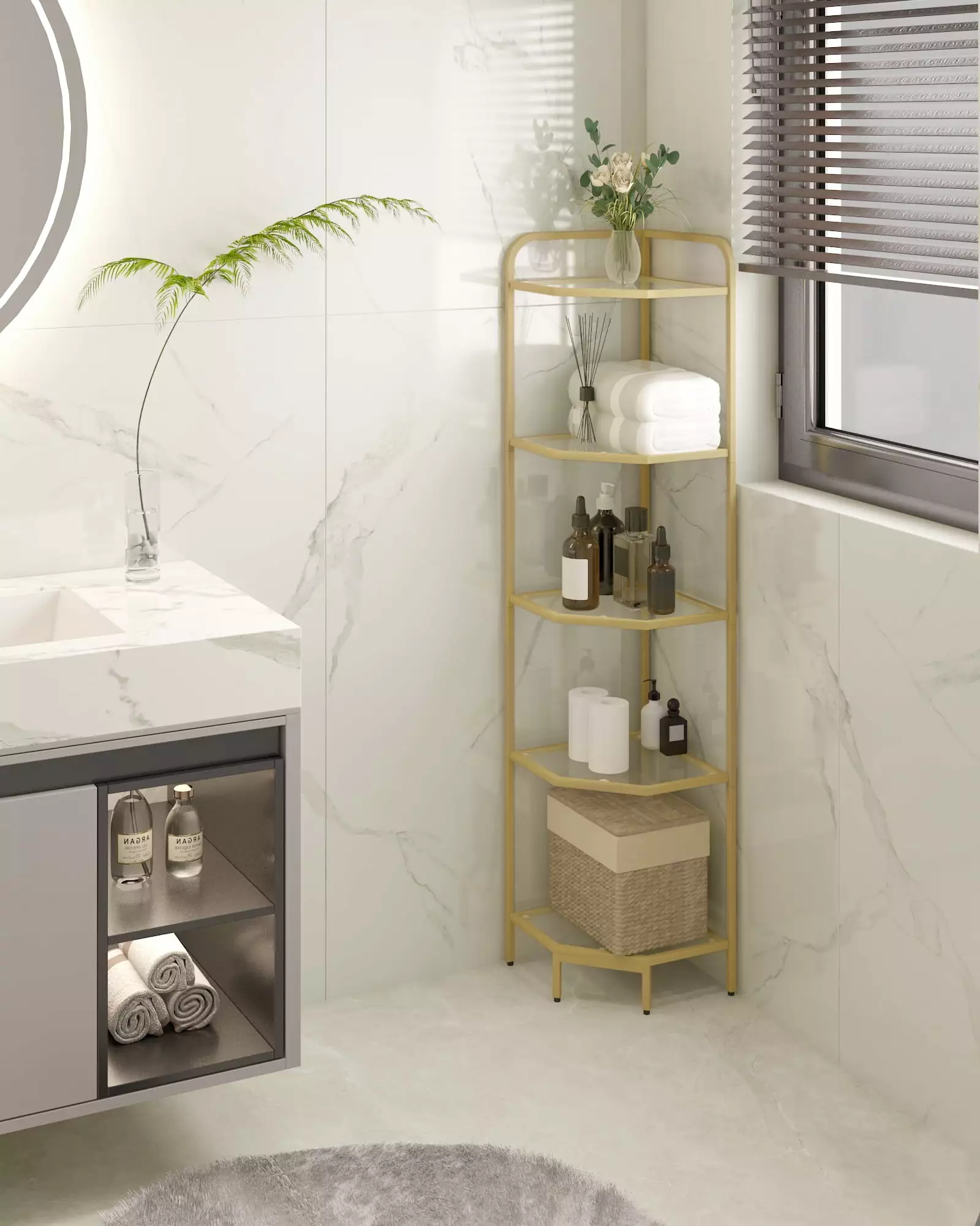 5-Tier Glass Corner Shelf Stand. Gold Corner Bookshelf. Bathroom Storage Rack Shelf. Plant Rack. Tempered Glass. Steel Frame. Modern Style for Living Room. Bathroom. Kitchen.