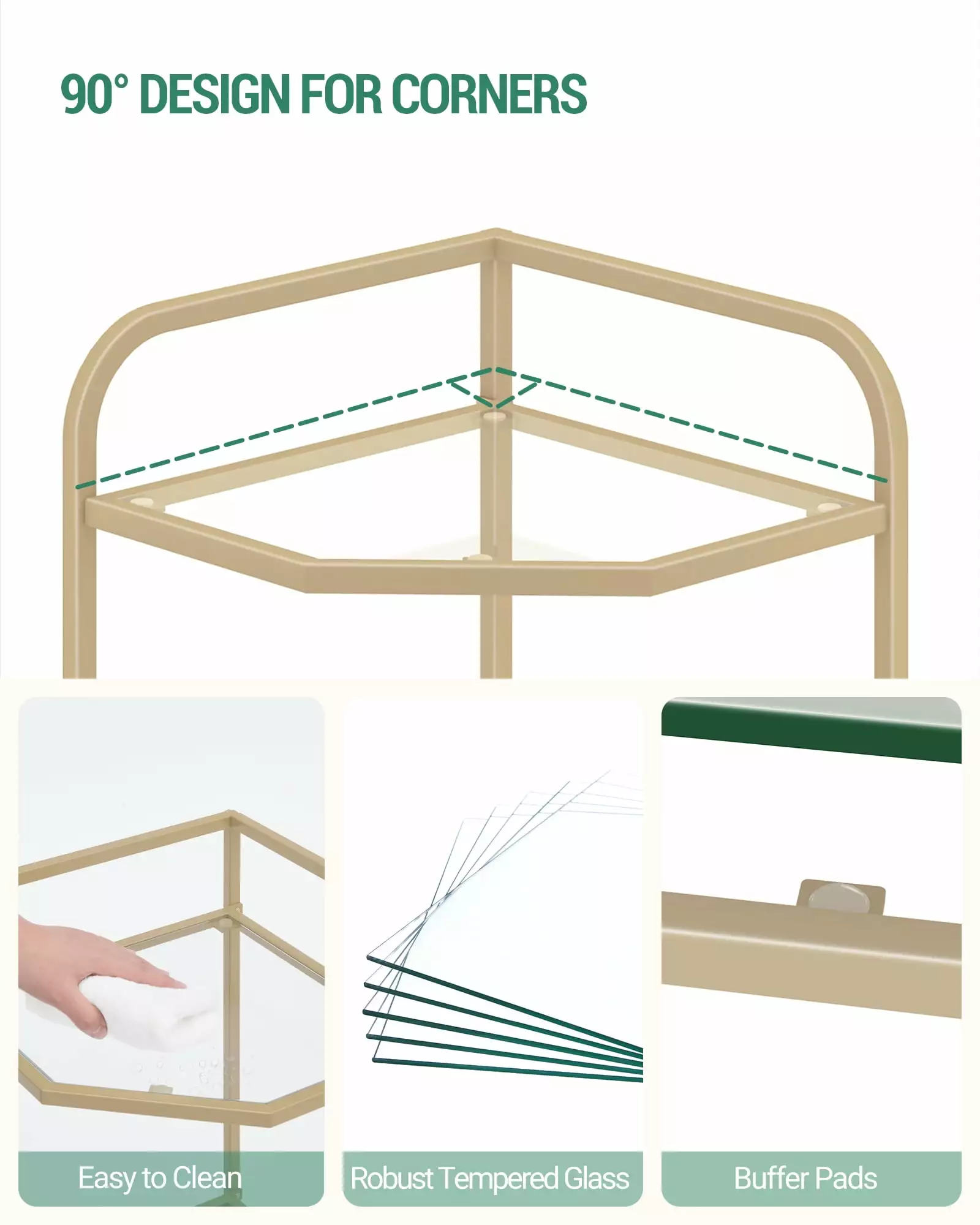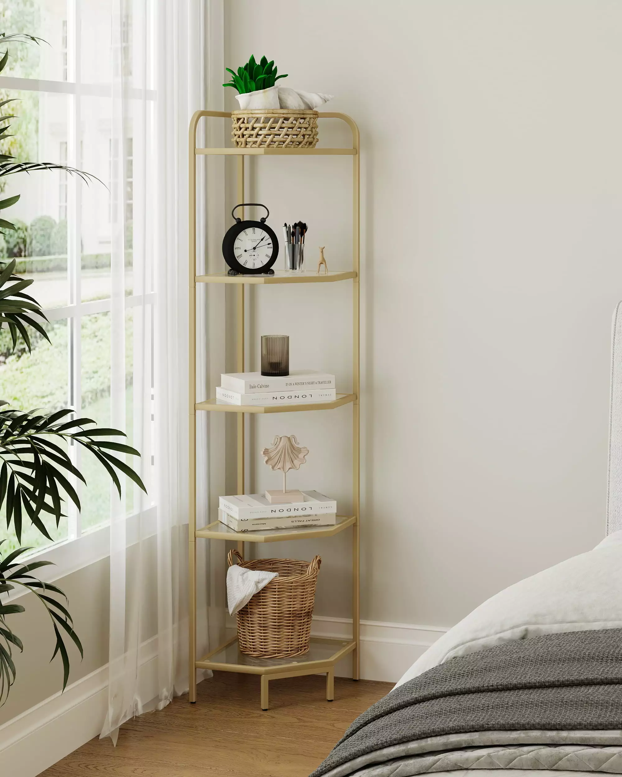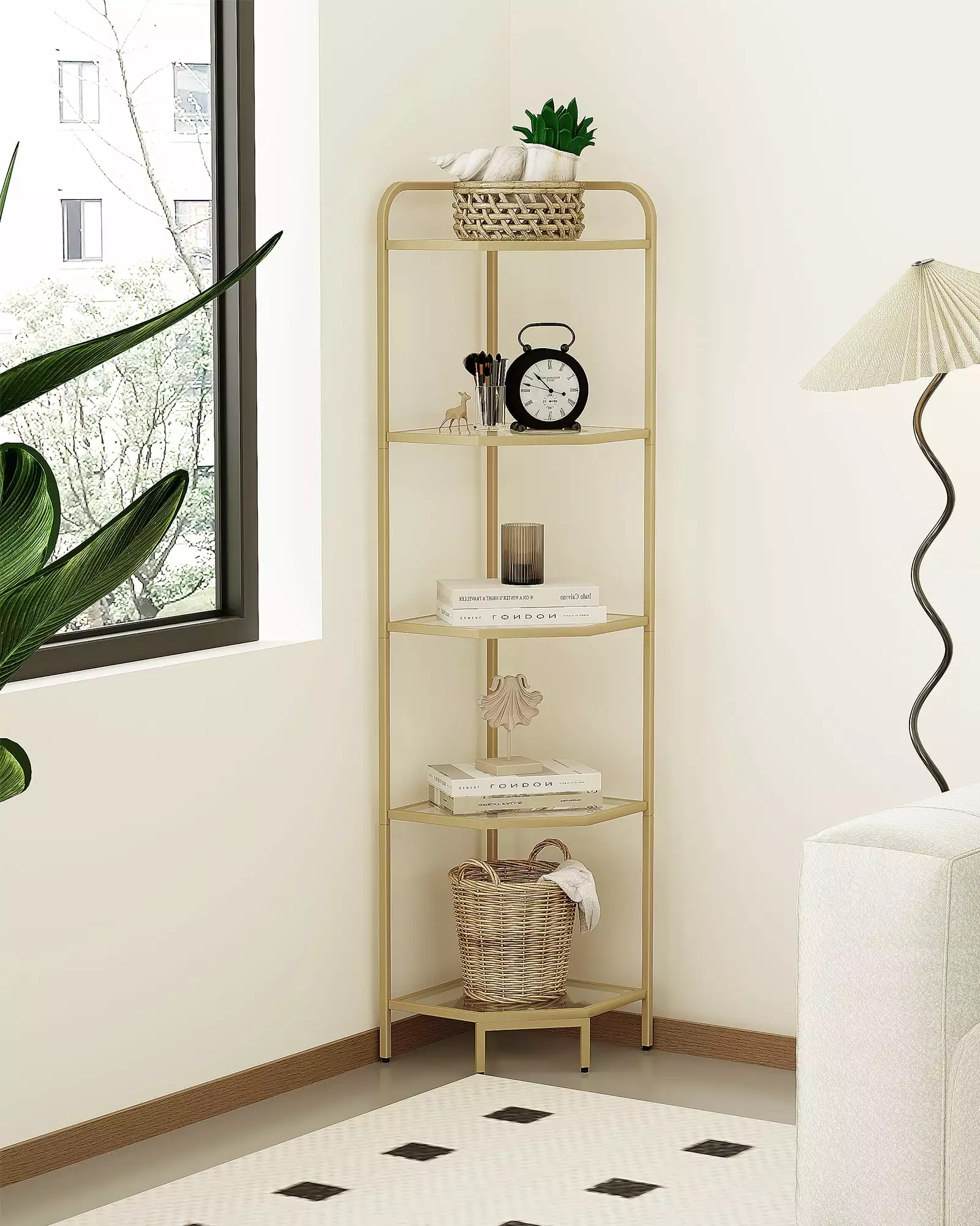 This 5-tier corner shelf with gold finish adds a touch of elegance to your living room or bedroom while also providing ample storage and display space for your books. photos. plants and other items. The triangle’s rounded edges are smooth to protect you and your family from scratches.