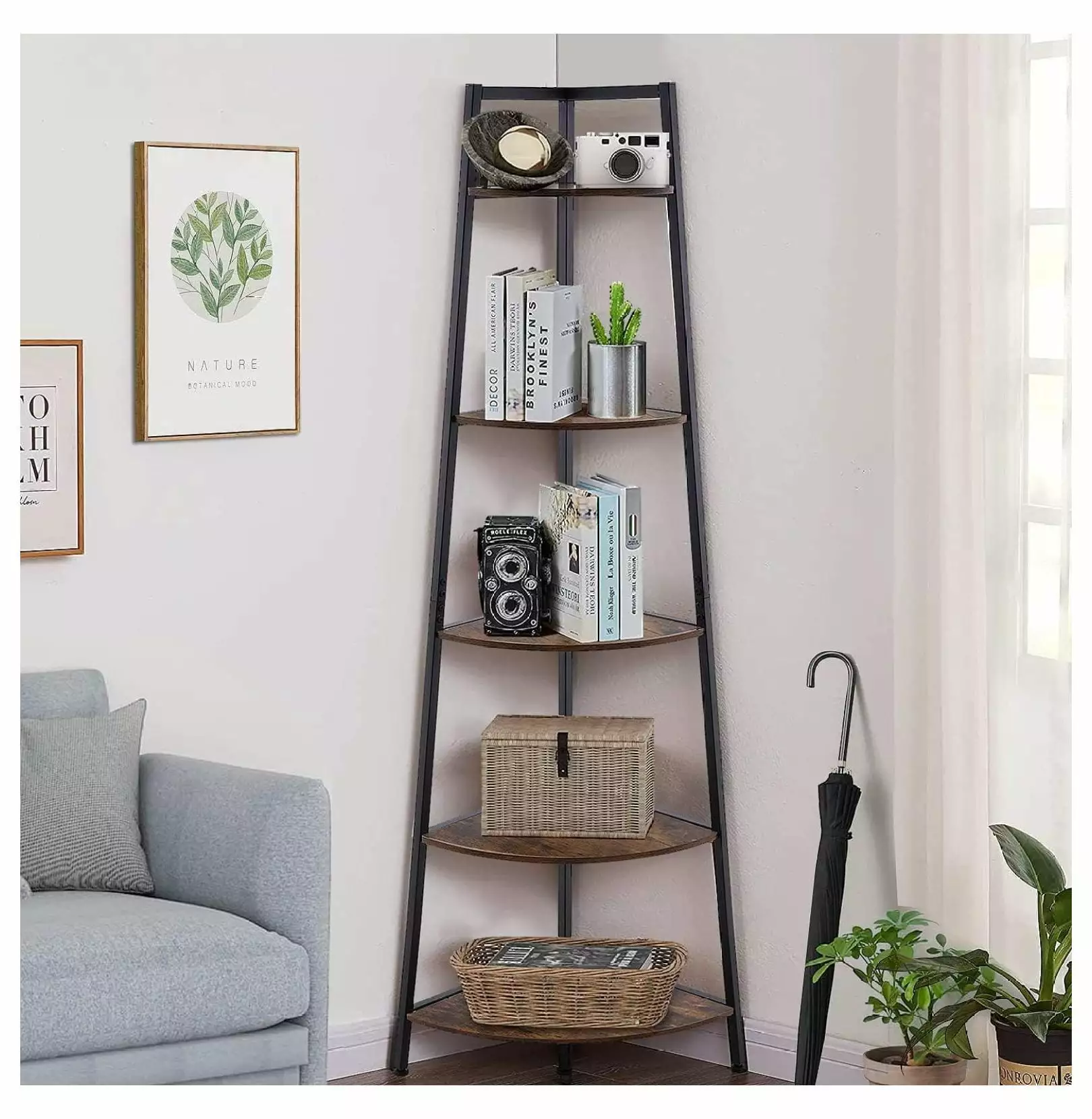 - Multi-Functional Corner FurnitureThis industrial large corner shelf with 5 shelves provide lots of space to display your books. plants. magazines. trinkets. photos and your favorite decorations. Stylish vintage industrial design compliment well with any decor . as bed room. bathroom. kitchen. closet. living room. office. etc