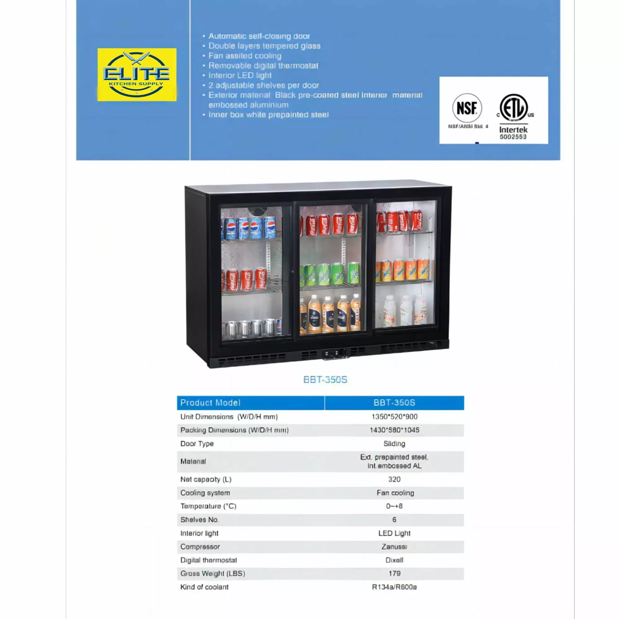 Welcome to Elite Kitchen Supply! Discover the versatility and style of our Merchandiser Beverage Back Bar Cooler with Slide Door. model BBT350S. Specifically crafted for commercial use. this cooler seamlessly blends functionality with an appealing display for your beverages. Elevate your beverage presentation with Elite. where innovation meets the high