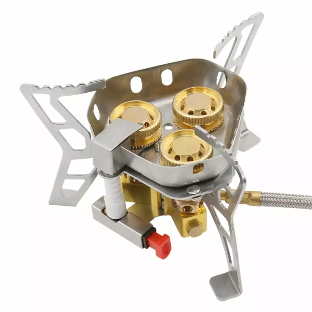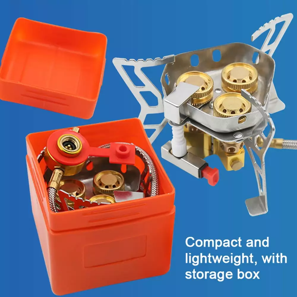 3-Cores Camping Stove 6800W High Power Gases Burner Windproof Backpacking Stove with Adjustable Valve for Outdoor Cooking Camping Picnic Hiking 3-cores camping stove. 6800W high . high combustion efficiency. with windproof design. more concentrated firepower. 0.55m metal housing air tube. effectively prevents tube from friction and collision in environment. extending service time. Compact and lightweight. with storage box. it is suitable for cooking. camping. picnics. backpacking. hiking. etc. Stainless steel base. placed stably. Valve with silicone dust . effectively blocking sand and dust from entering tube. Push button electronic ignition with adjustable valve. easy to adjust firepower to meet your different cooking needs. High temperature resistant thickened bracket with antislip corrugated design. can firmly support pots and pans.