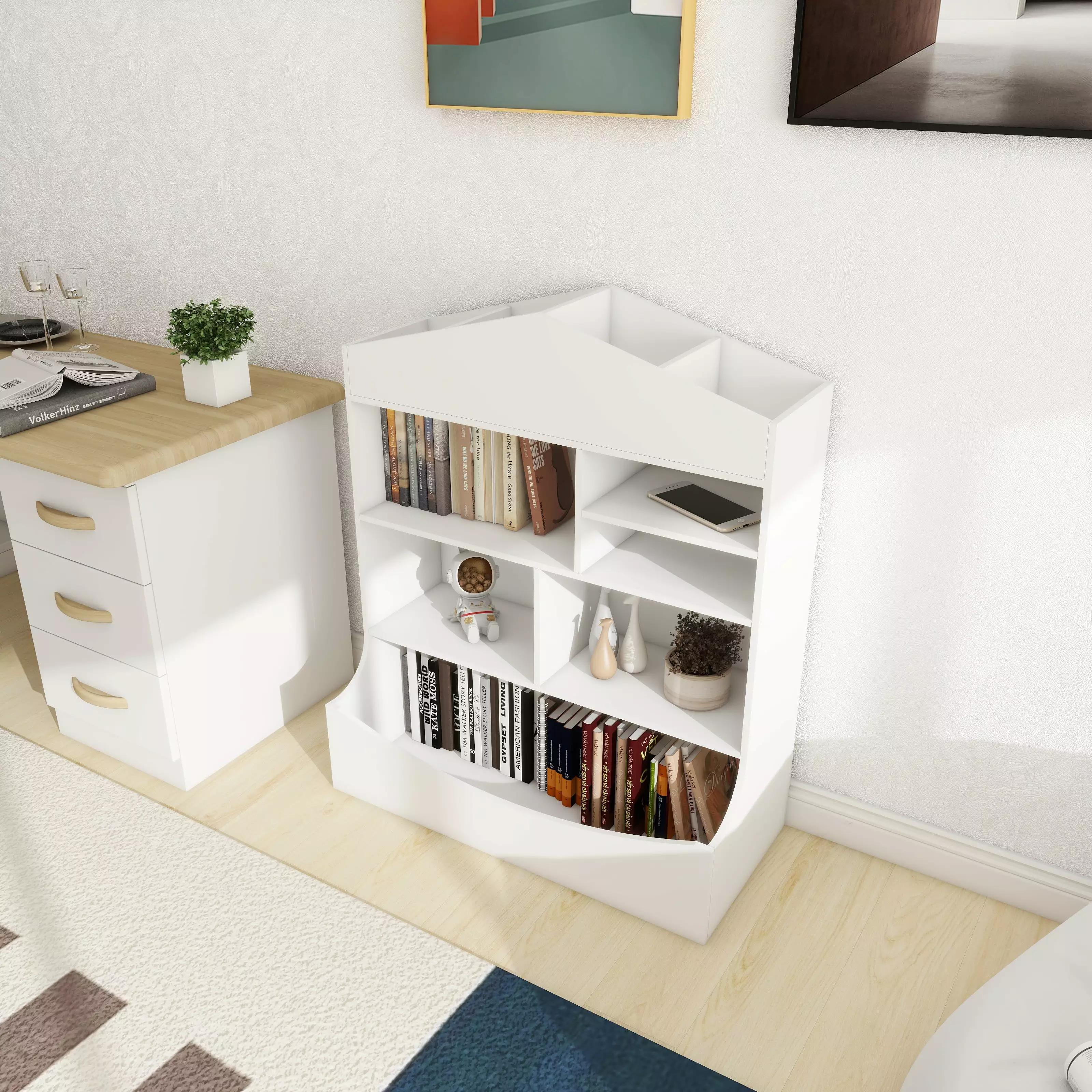 Stable & Durable: This bookshelf is made of E1 grade MDF and can withstand a maximum weight of 50lbs.Easy to match& wide application: This toy organizer has nine open compartments for storing kids’ favorite books and notebooks. There is a large storage box for kids to store their toys and other items as well. It can be used not only as a children’s bookshelf. but also as a toy organizer. snack organizer or adult organizer.