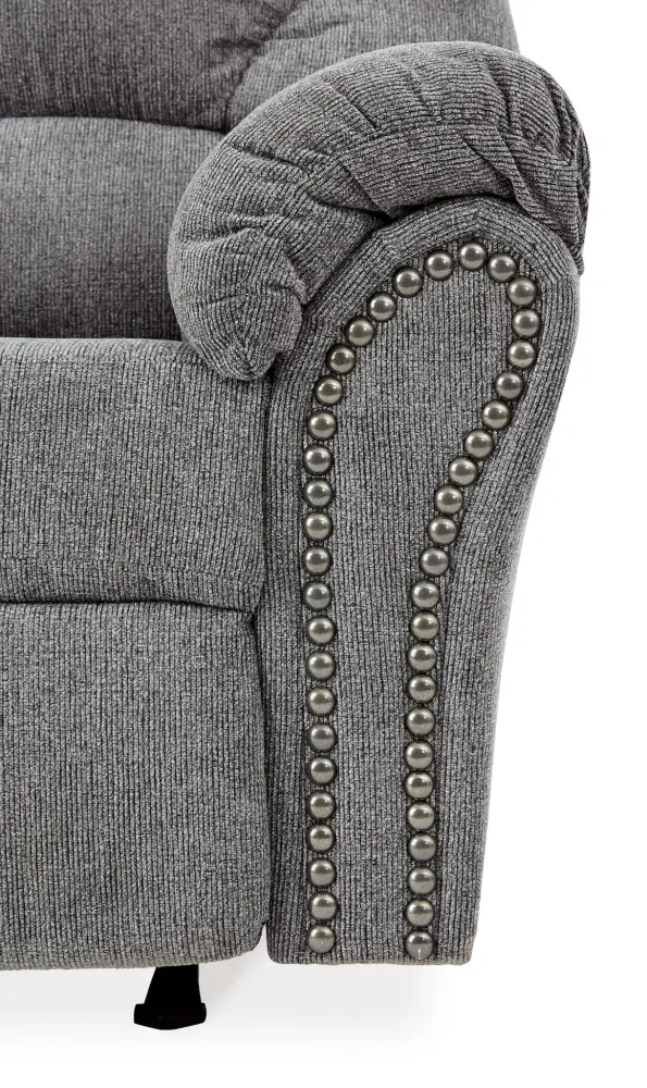 Why sacrifice comfort for style (or style for comfort) when you can have the best of both in this rocker recliner in pewter gray. Elements include a chic divided-back design and pillow top wrapped armrests that make nodding off all too easy. Calling attention to the elegantly flared armrests—black nickel nailhead trim for a punch of crisp character.