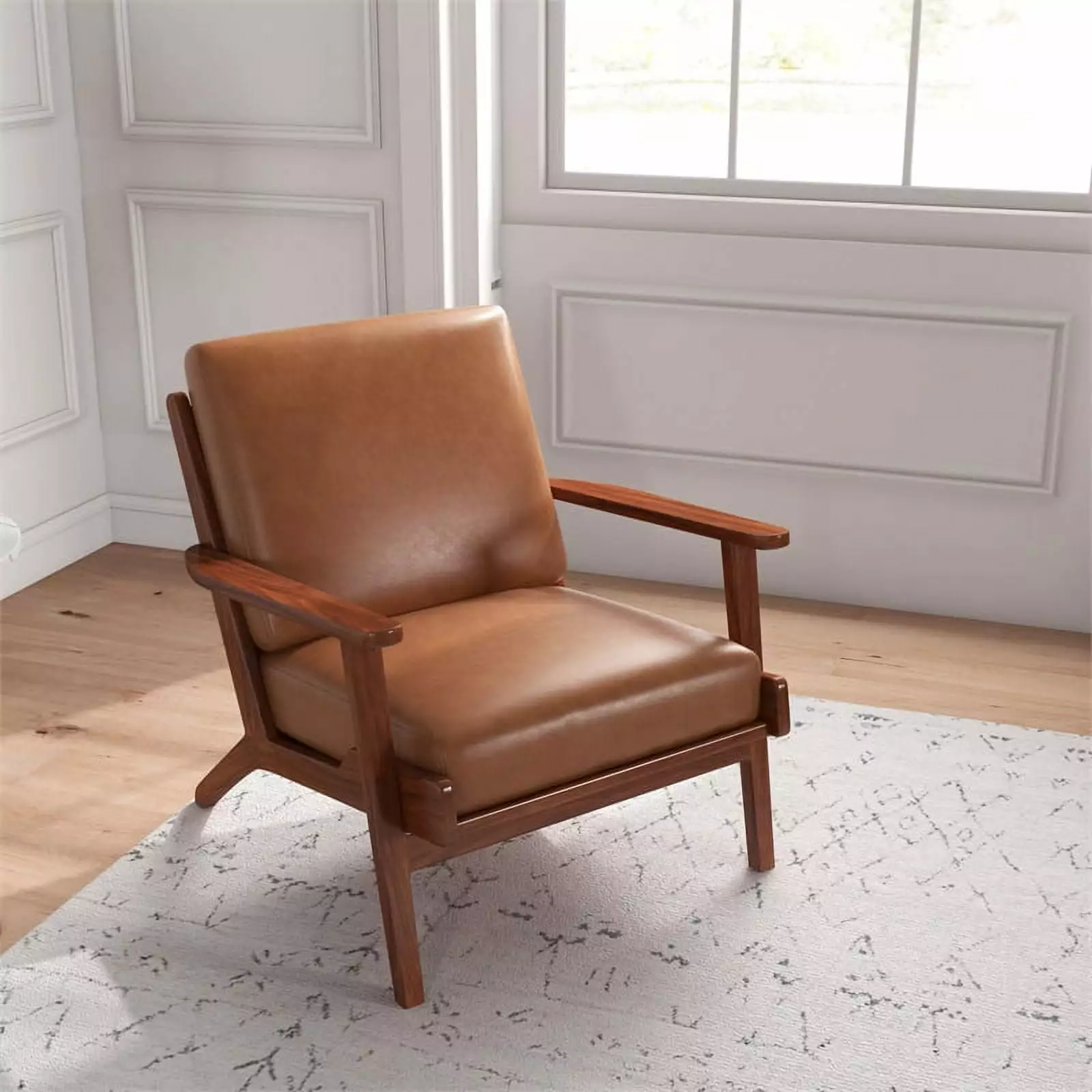 Make a statement in your living room with this mid-century-inspired Allora Mid-Century Modern Genuine Leather Lounge Chair in Brown. Founded atop four walnut-finished legs. this piece is crafted with a solid wood frame. high-density foam padding which lends comfort to the seat. Upholstered in durable. high-quality Genuine Leather . this tasteful piece features elegant square arms for convenience. Can be cleaned with a non-abrasive cleaning solution followed by a quick microfiber cloth. Removable legs allow for simple delivery for tight spaces. Available in a variety of timeless colors. you’re sure to find something that matches your decor. Due to leather’s natural characteristic. texture and color may vary.