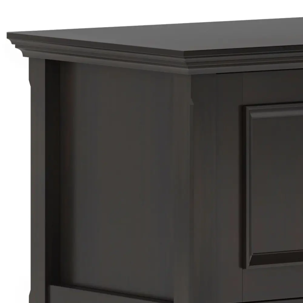 - Transitional design includes tapered legs, panel framed door fronts, and antique bronze round decorative knobs