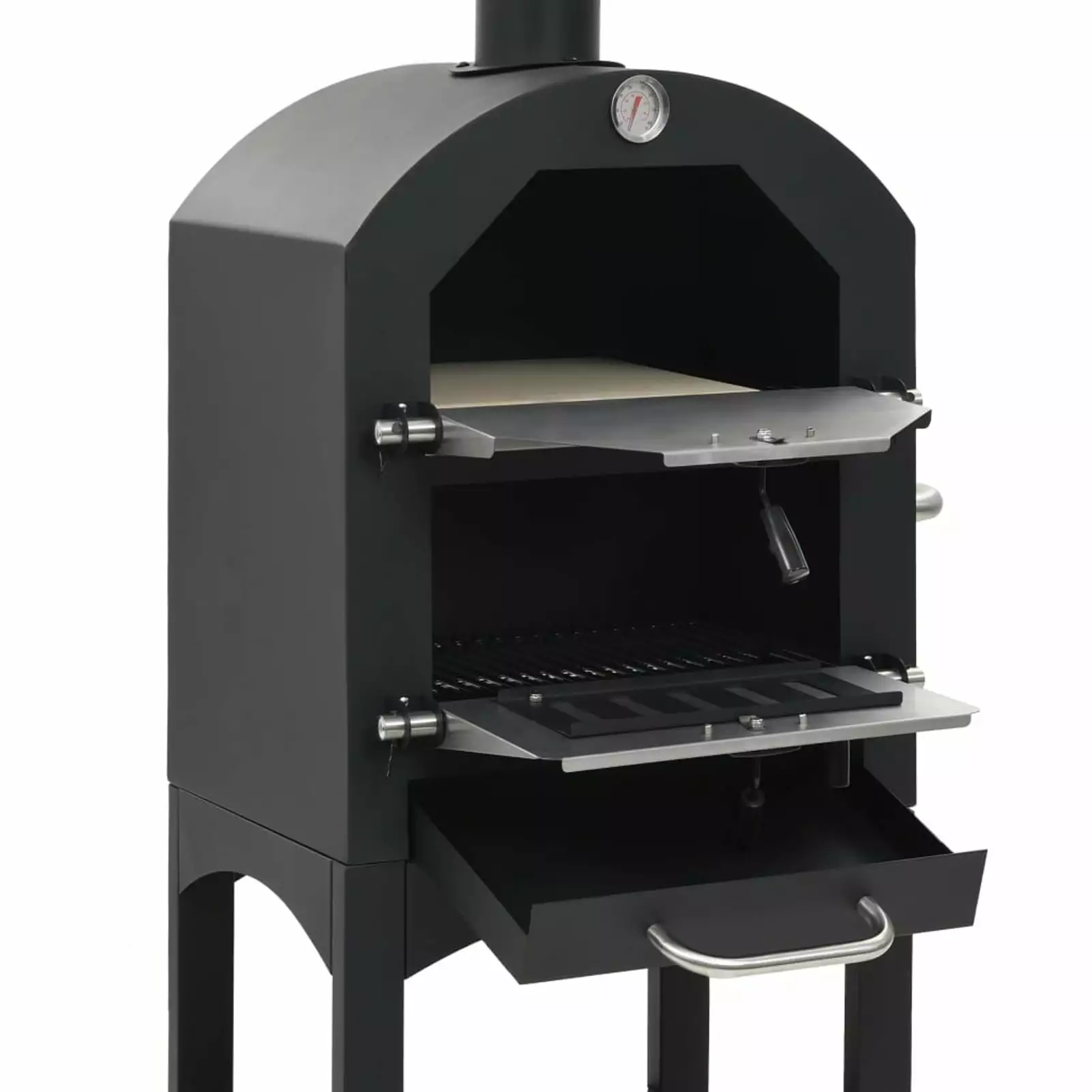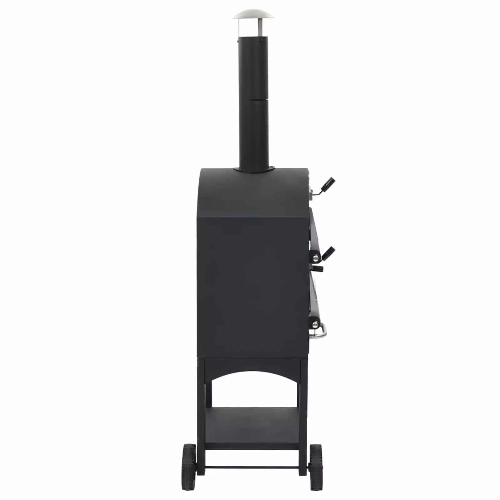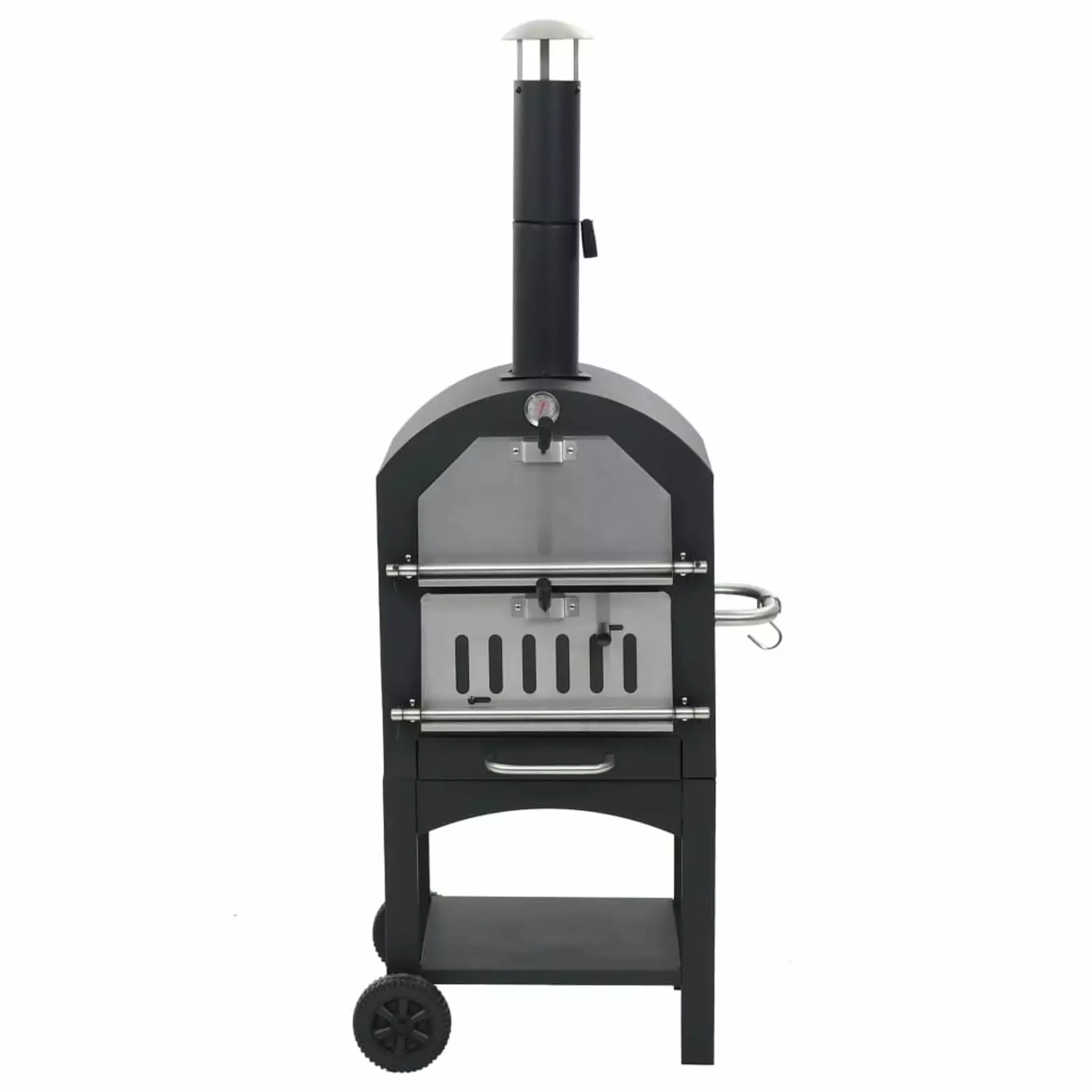 Made of high-quality powder-coated steel. this oven is highly robust and durable. The fire tray is removable. allowing for quick and . The practical shelf underneath provides space for storing oven gloves or other supplies. This oven also comes with a built-in thermometer which displays the cooking temperature inside. Thanks to the two wheels. the smoker is easy to move around. A pizza stone is also included in delivery.