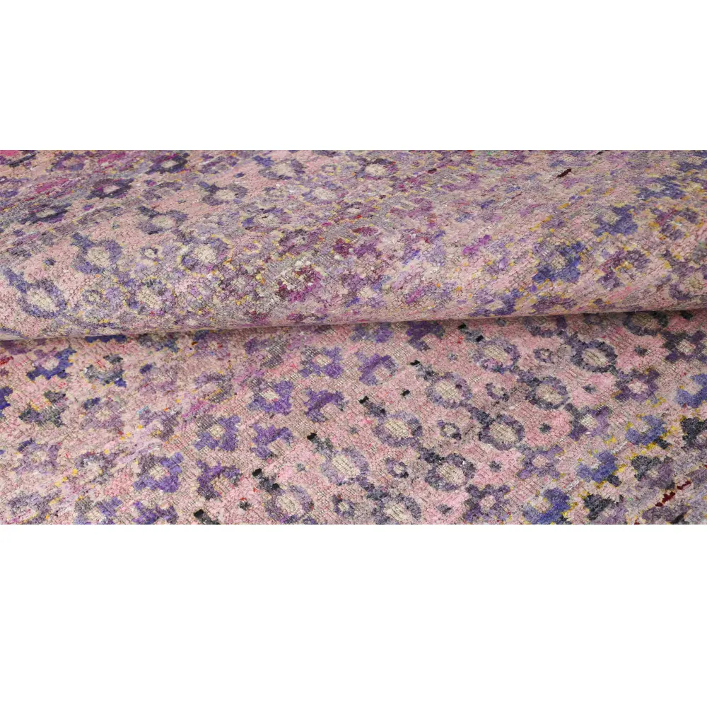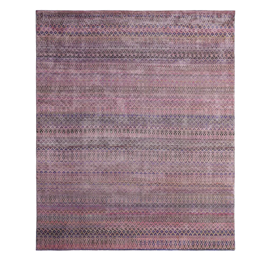 Enhance your space with this Aura Alchemy Silk Transitional Rug – Hyderabad. This exquisite piece features a symphony of geometric shapes in shades of pink, amethyst, cobalt, and beige. The intricate design exudes richness and depth, adding texture and elegance to any room. Crafted from high-quality silk, this luxurious rug is a true masterpiece. Available in a variety of sizes.