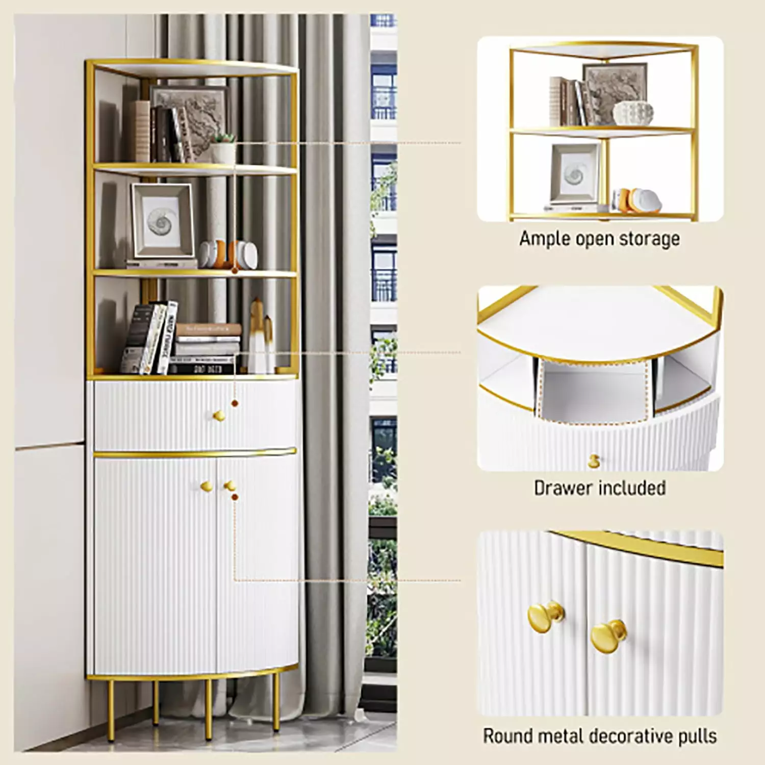 Product Name:74.8 Tall Modern Corner Bookshelf.Fan-Shaped bookcase with 1 Drawer and 2 Doors .Wooden Standing Corner Shelf with Gold Metal Frame for Living Room.Home Office.White