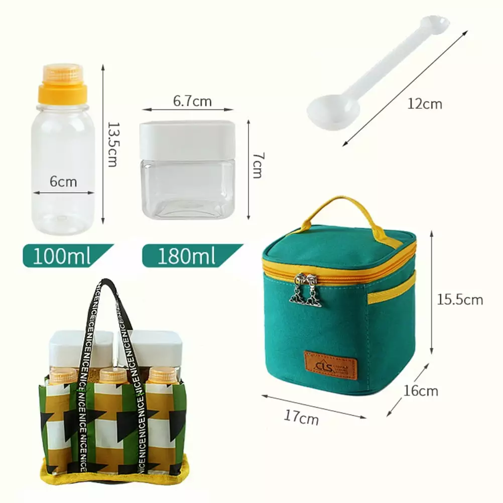 – It comes with 4pcs 180ml solid bottle. 3pcs 115ml liquid bottle. a measuring spoon. a internal storage bag and a external storage bag. easy to use.