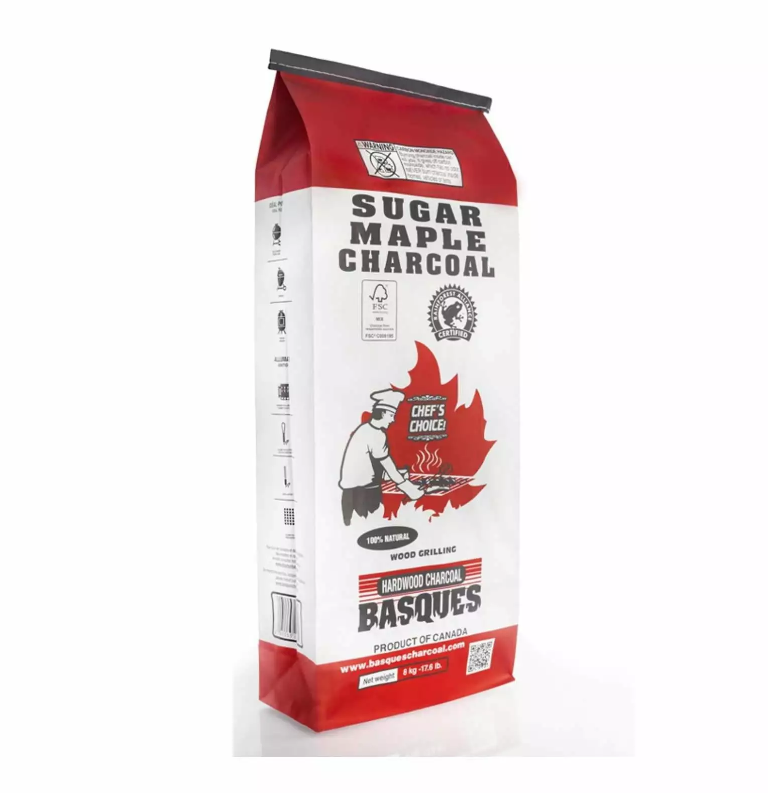 Highlights: Size: 17.6 lbs Organic: No Charcoal Type: Sugar Maple Lights faster. burns hotter Product is made in an environmentally friendly way. has FSC and Rainforest certifications We’ve got your next barbecue covered! Packaging Type: BaggedBasques Sugar Maple All Natural Hardwood Lump Charcoal 17.6 lb.