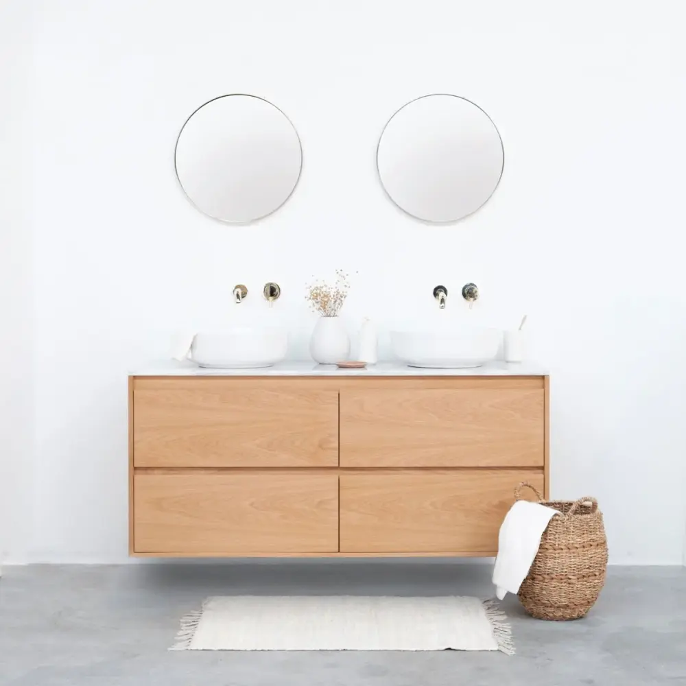 Bathroom furniture Scandinavian ANN – – Oak ● Built-In Hamper Compartment ● Water-Resistant Finish Applied ▶ Select Your Perfect Vanity Style