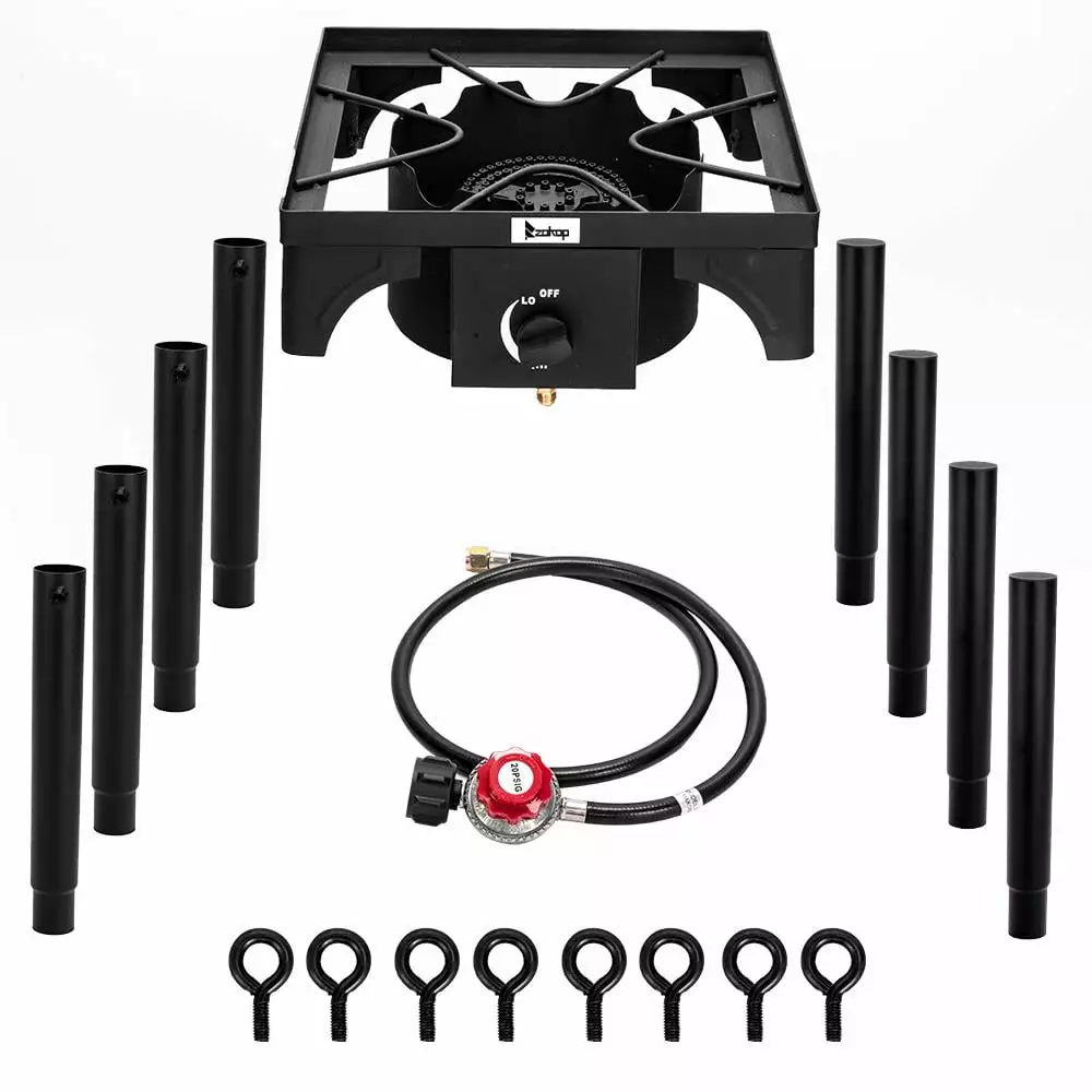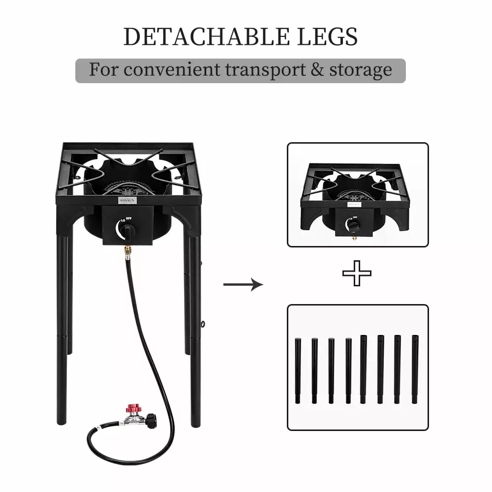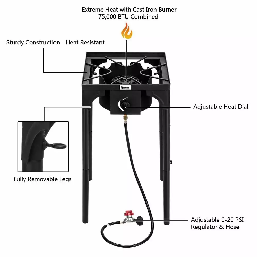 HIGH OUTPUT:This powerful single burner. equipped with a cast iron head. outputs a whopping BTU of 75000.