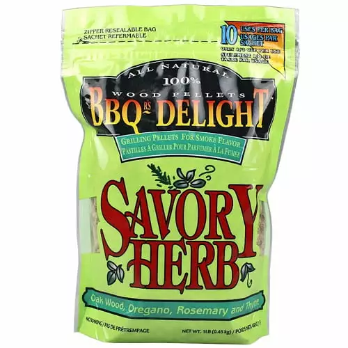 - 1-pound bag of all-natural BBQr’s Delight Savory Herbs Wood Pellets