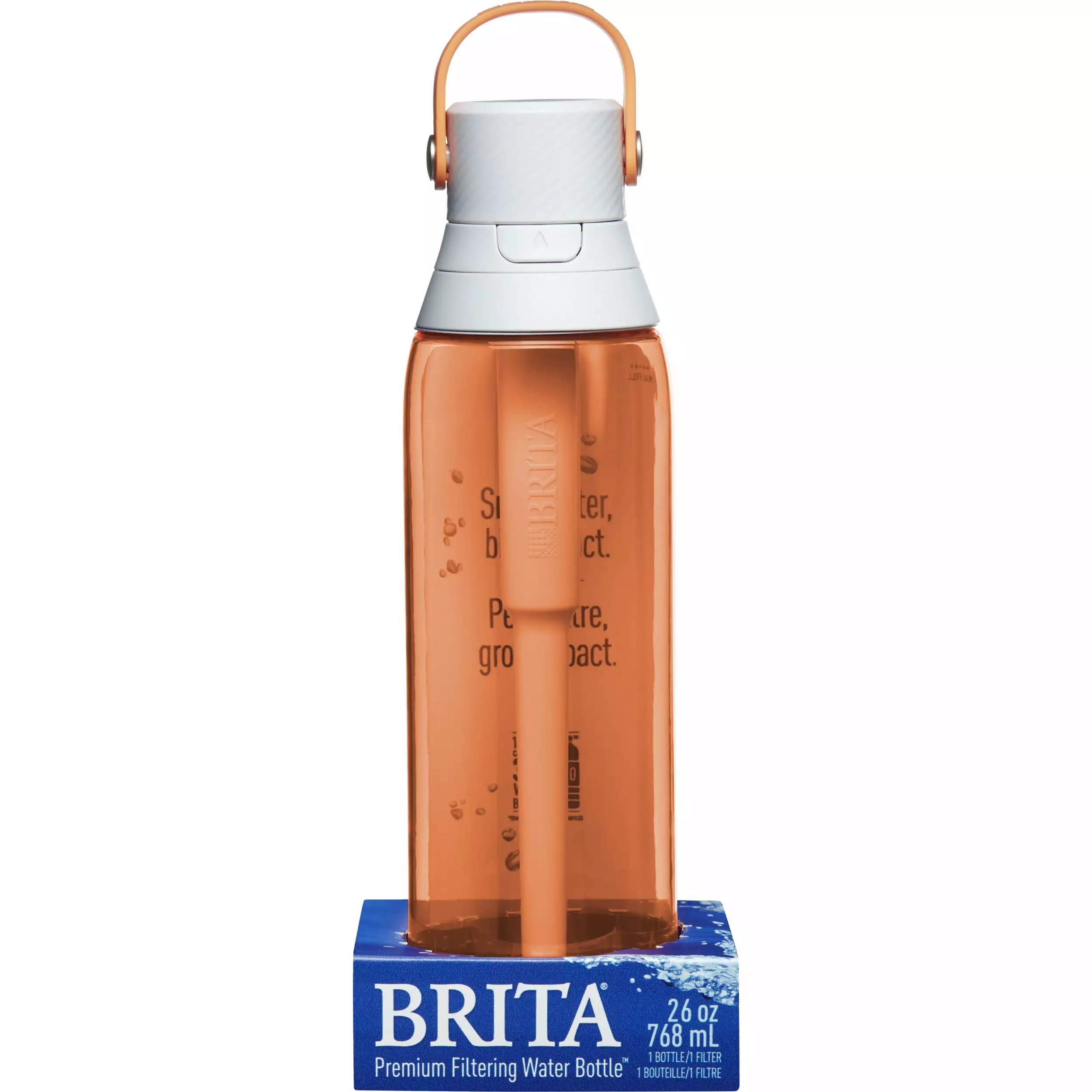 - The BPA-free Brita Premium Filtering Bottle holds 26 oz of water. and is designed with a Brita filter that fits in the straw and makes water taste great