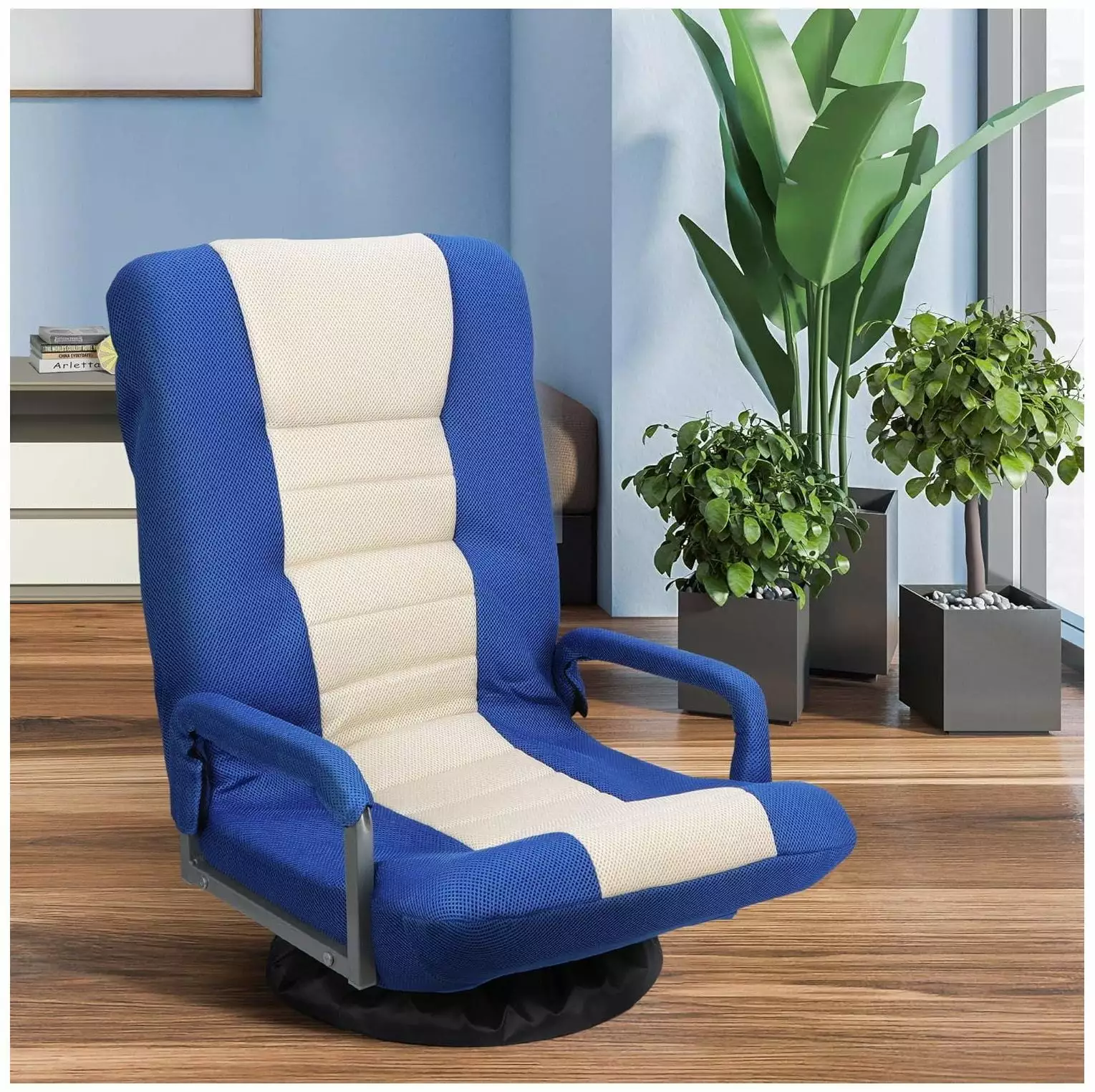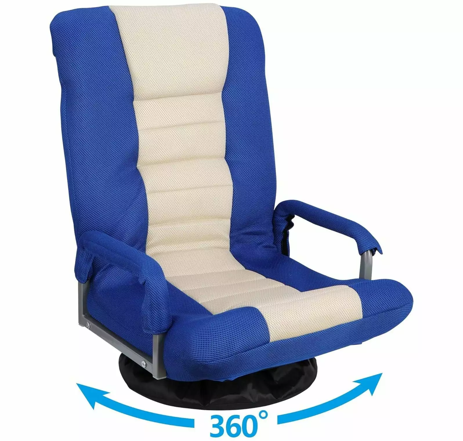 FeaturesWant to enjoy the holiday. indulge in electronic equipment. but the sofa is too far away. the floor is too hard. This foldable 360-degree swivel floor chair can solve these problemsFlexible design and durable materials ensure that the chair is strong and easy to useHigh density cotton is used as filling material. and then wrapped with mesh surface. The touch is elastic and soft. but it will not produce stuffy heat. It can cure your spirit and relieve your fatigue when you are enjoying games360-degree swivel design and five-position adjustable back. whether it’s sitting in a chair excitedly while playing games or lying lazily in a chair while watching TV. this chair can meet your needsBest choice for gamersSpecificationsOverall Dimensions: 20.28"W*26.18"D*28.94"HFloor to seat: (Front)9.84" (Side)7.28"Back: 20.87"*23.23"Seat: 18.9"*20.08"Folded size: 21.65"L*20.28"W*13.19"HWeight Capacity: 300 lbsWeight:16.58 lbsColor: Blue &. BeigeNo assembly requiredPackage IncludesFloor Chair*1BULYAXIA 360 Degree Swivel Gaming Chair Foldable Floor Sofa Chair for TV Reading Playing Video Games with Lumbar Support. Armrest Handles. Adjustable Backrest. Blue & Beige