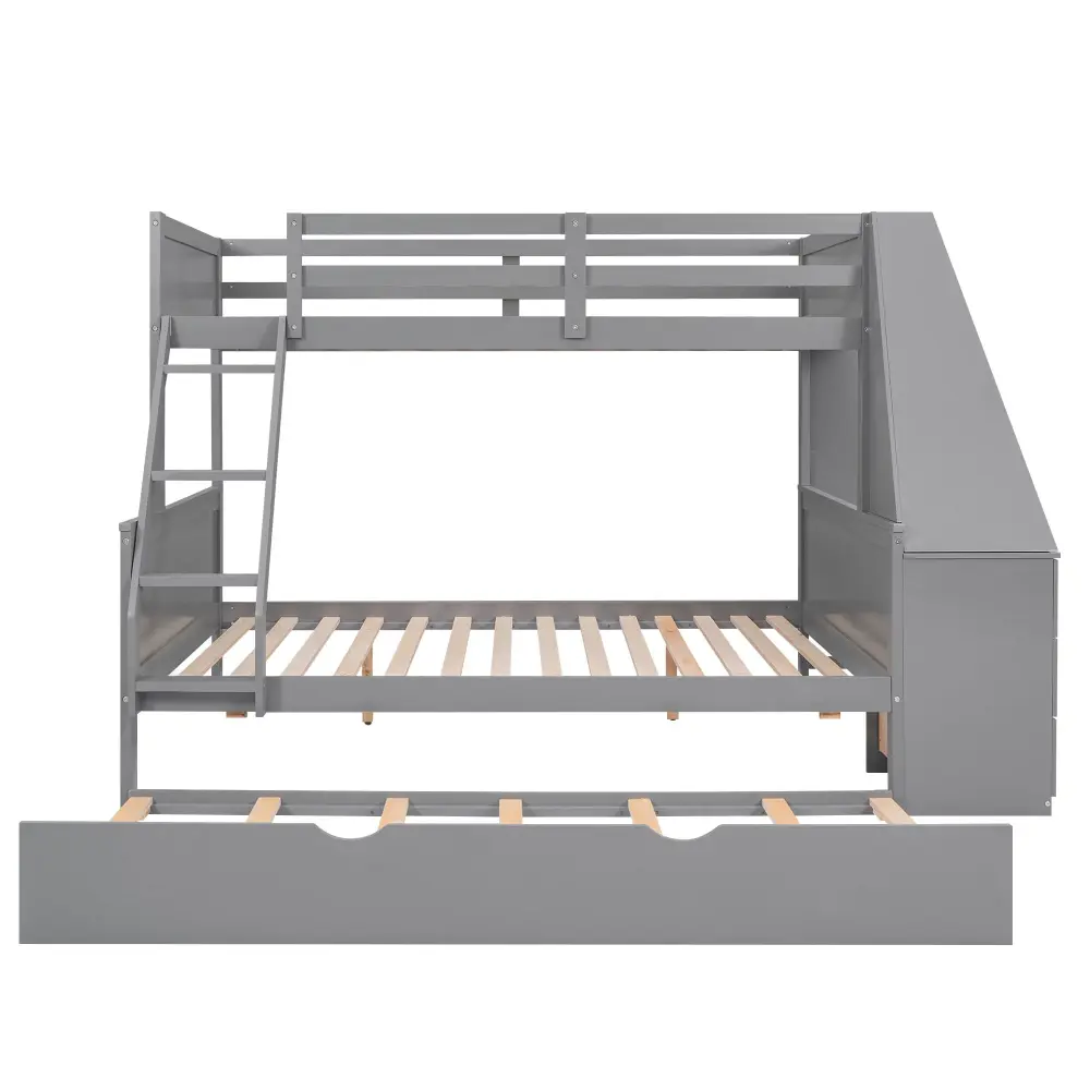 Twin Over Full Bunk Bed With Trundle And Built In Desk, 3 Storage Drawers And Shelf – Gray