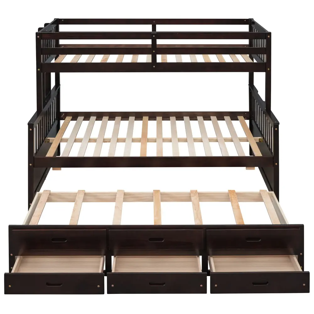 Sturdy construction & Unique design Solid pine wood and high-quality provide stability. Supports slats enhance weight capacity. This separable bunk bed with three beds and drawers is ideal for jumbo families, efficiently saving room space.