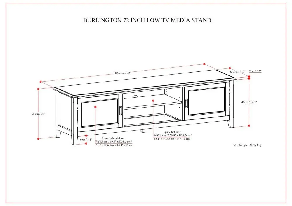 - DIMENSIONS: 17″ D x 72″ W x 20″ H