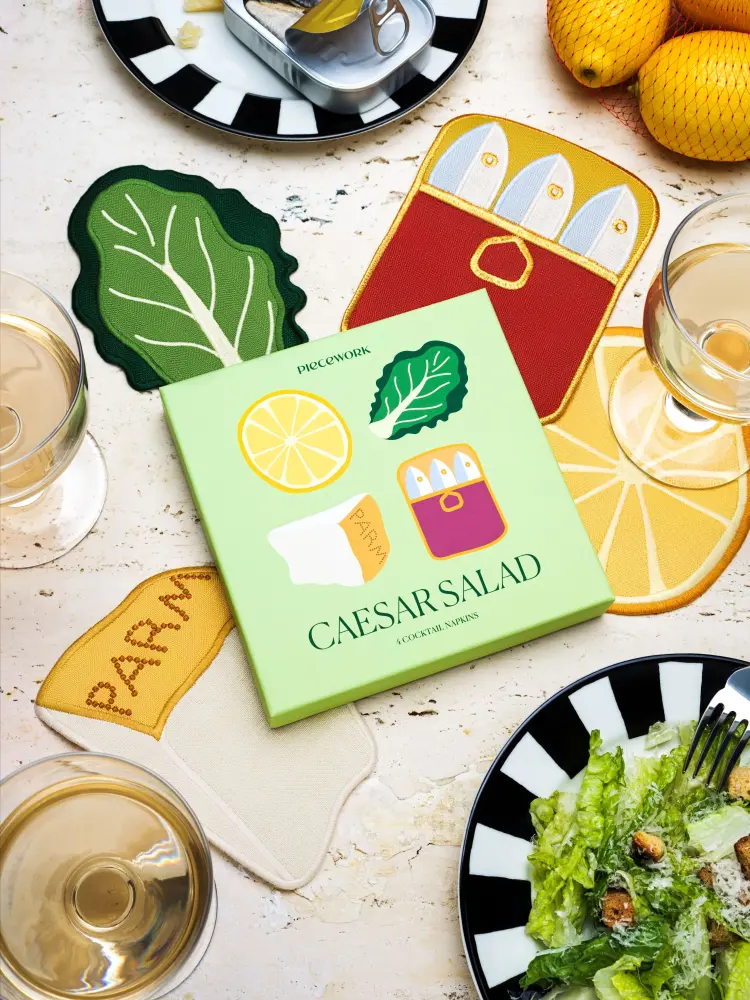 This set of four 100% linen cocktail napkins comes with a lemon wheel, a parmesan wedge, a romaine leaf, and (of course) a very chic tinned fish. Toss into any gathering for instant flavor.