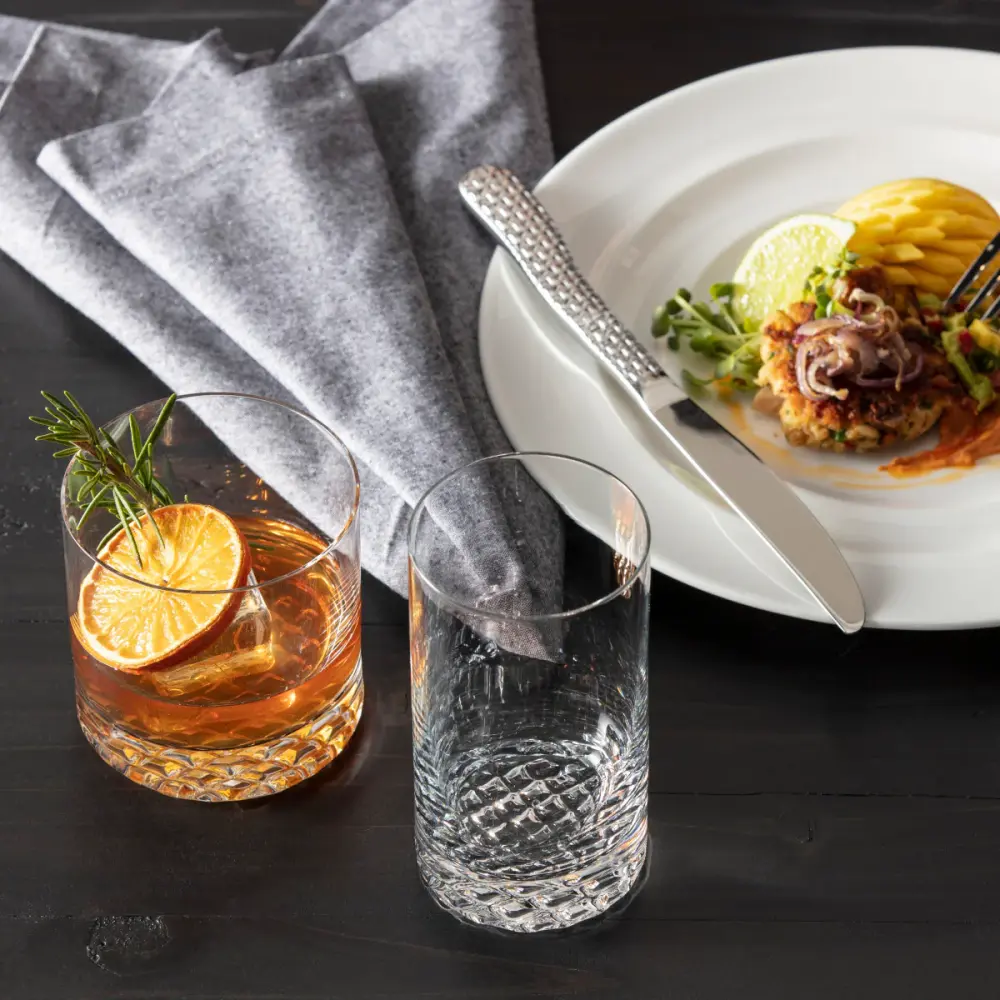 The crisscross pattern in the base creates an unmistakable play of portable and color. Gold-hued whiskey, classic highball drinks, and colorful cocktails shimmer with elegance.
