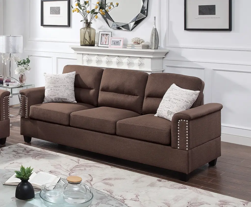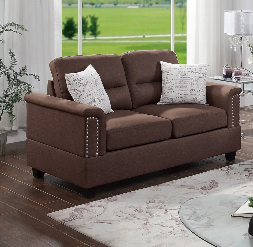 Majestic Living Room Plush Cushion Comfort Couch 2pcs Sofa Set Family Sofa And Loveseat Linen Like Fabric. Dimensions: Sofa :- 84" x 34" x 35"H Loveseat :-61" x 34" x 35"H Listing Include : Sofa And Loveseat Only. Shipping include Curb side Delivery. No inside home delivery. Simple assembly require. Shipment will take around 10-15 business days. Description :- Showcase your living room with this vintage yet simple two piece sofa set. Upholstered with mix linen-like fabric and extra soft cushions. this set is as comfortable as you hope you could be. Featuring studded arm rest that adds a bit of extra care finishing. this set also comes with spacious love seat and a three seats sofa. It also includes four soft pillows that adds to look and provides more comfort.Chocolate Contemporary Style Living Room Furniture 2pcs Sofa set Fabric Sofa And Loveseat Plush Cushion Couch