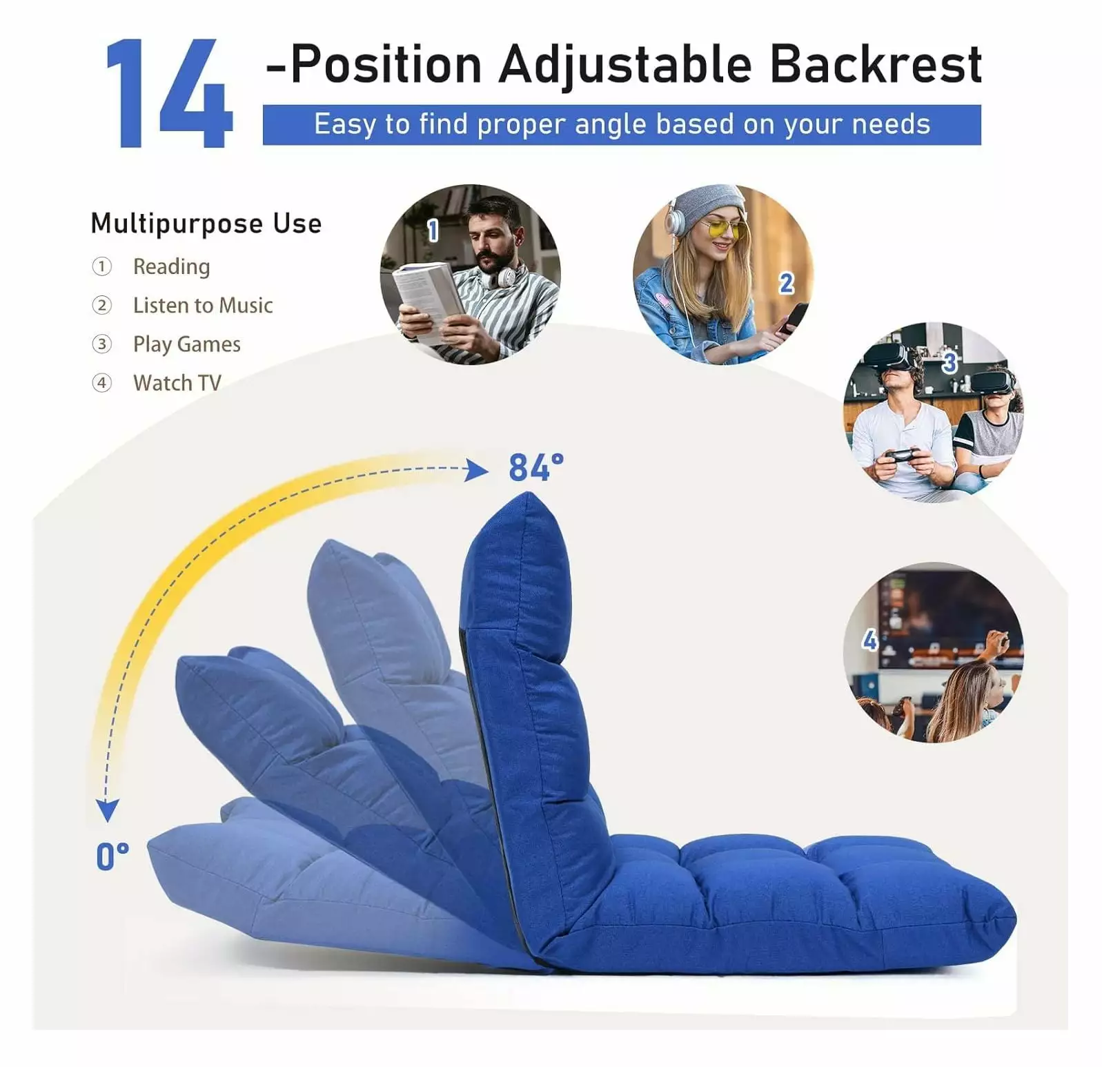 We are a loyal seller. if you find any dissatisfaction in the shopping process. please contact our customer service in time to solve. we will try our best to do the best service. the product itself problems we will be fully refunded. hope you have a pleasant shopping trip!CodYinFI Floor Chair. Folding Gaming Chair with Back Support. 14 Adjustable Positions. Alloy Steel Frame. Lazy Sofa Lounge for Playing Reading Meditating Room Recliner for Adults. Kids (Blue)