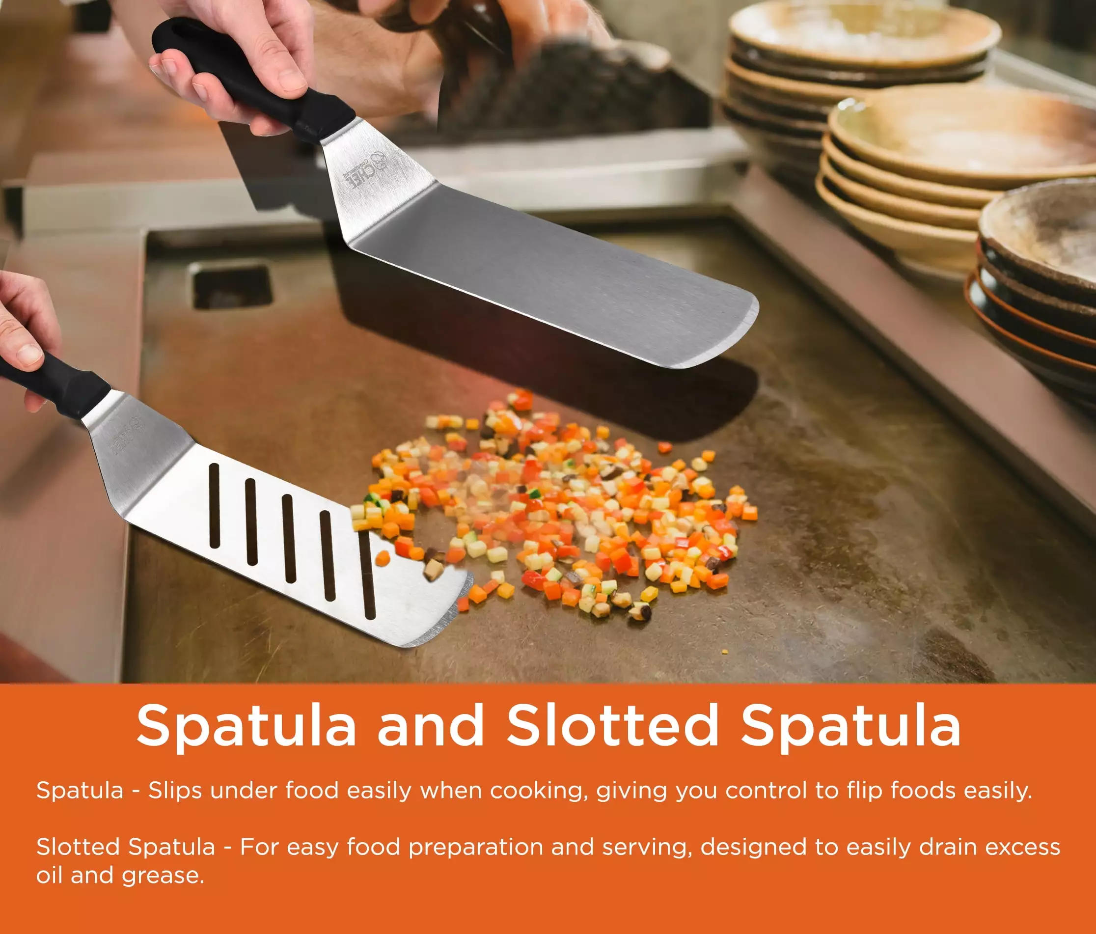 - PERFECT STARTER SET – If you’re looking for a professional-grade accessory tool kit that is easy to clean and worthy to be in your kitchen we got you covered. Our 9 pcs griddle accessory bundle has Spatula. Slotted Spatula. Flipper. Slotted Flipper. Chopper. 12 Tongs. 2 Squeeze Bottles. and 1 Carrying Bag.