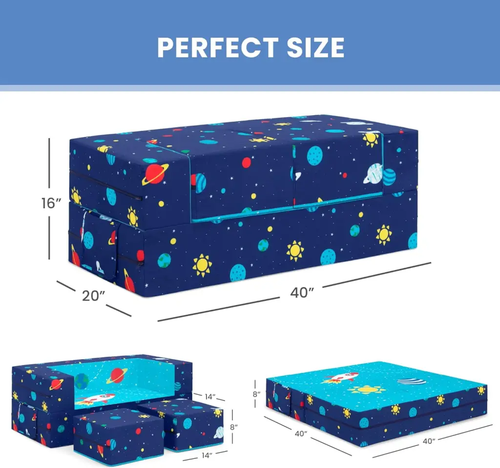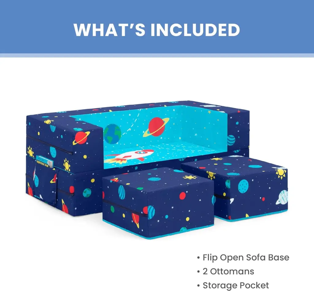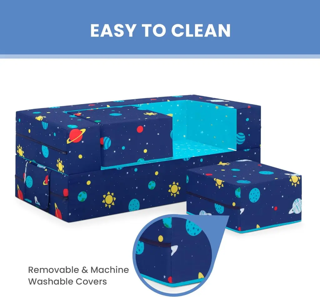 It’s a sofa! It’s a play mat! It’s a fort! The Convertible Foam Sofa and Play Set by can be whatever your child imagines. The sofa’s convertible design with two included ottomans allows your little one to use it in so many ways. Use it as a sofa to watch TV. flip it open to use as a play mat or move the parts to configure a puppet theater. castle. ball pit or obstacle course. This modular play couch made up of three foam pieces will give kids hours of entertainment and encourage imaginative play while helping improve gross motor skills. The perfect addition to your child’s bedroom or playroom. the sofa’s sturdy foam base and soft slipcover with a storage pocket and printed with a super-cool outer space pattern is a super-safe play structure. Slipcovers are removable and machine washable. Recommended for ages 18 months and up.