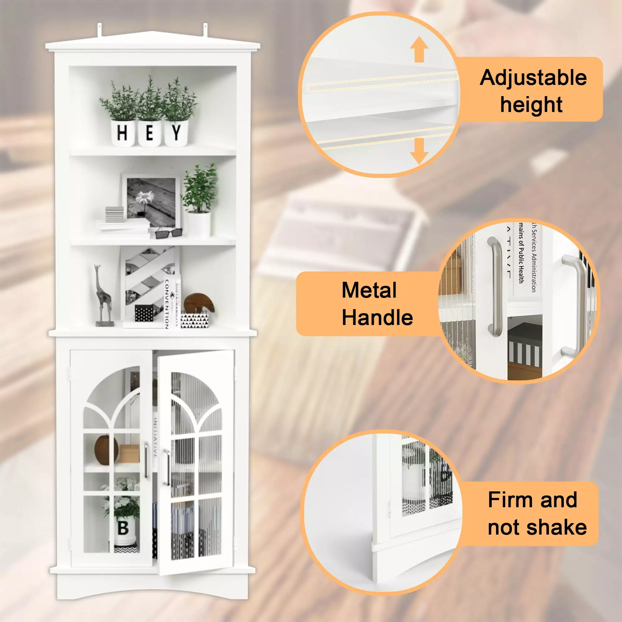 - corner cabinet maximizes the expanded storage space. Tall corner cabinet with 3-tier open shelves & 1 adjustable board inside door freely storage for displays. necessaries. and sundries.