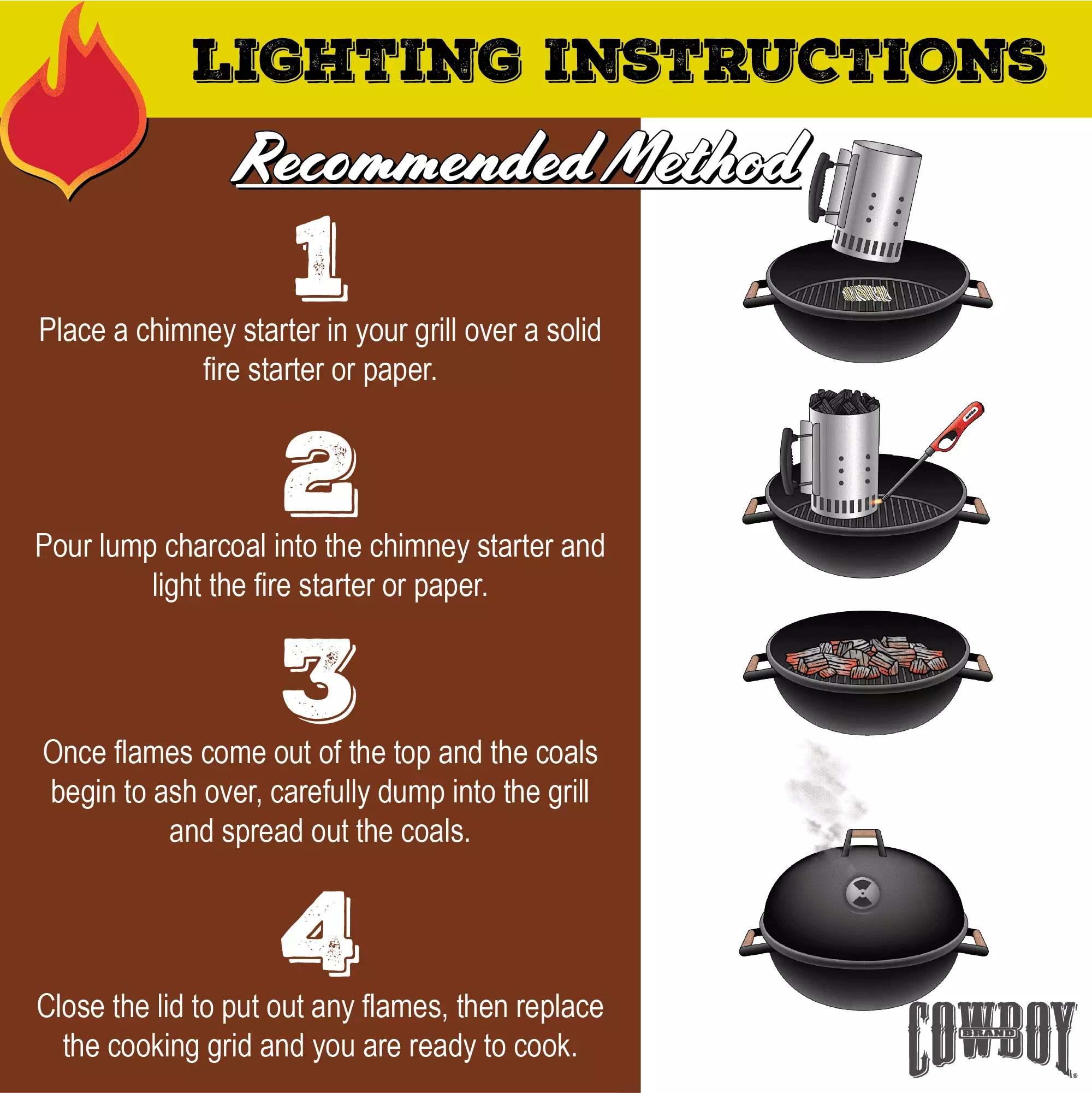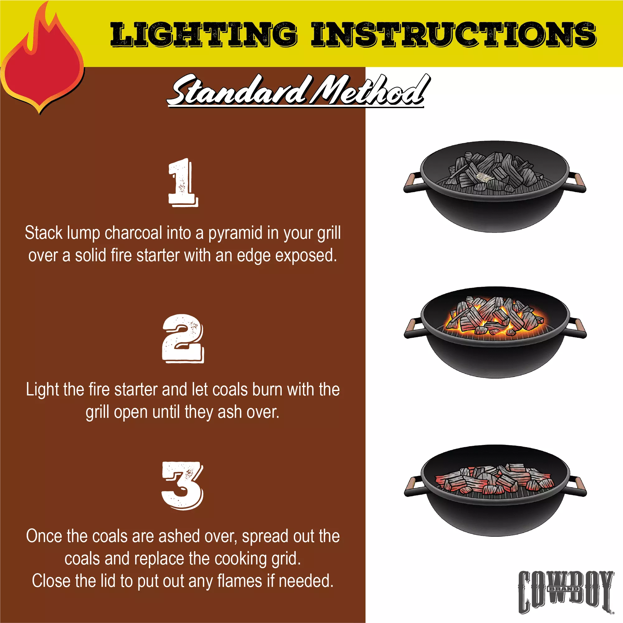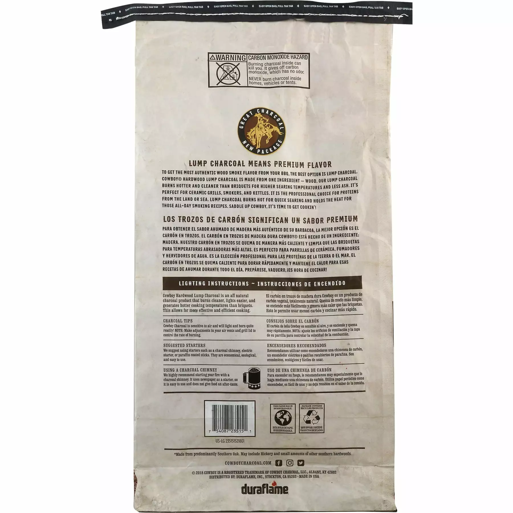 Cowboy® Oak & Hickory 15 lbs Hardwood Lump Charcoal is made from one ingredient – wood. We use only the highest quality oak and hickory hardwoods. No chemicals or fillers are added – just authentic. real wood for the best barbecue flavor. Lights easily and ready to cook faster than standard briquets. Great for use in all styles of outdoor cooking appliances. especially ceramic grills. smokers and kettles.