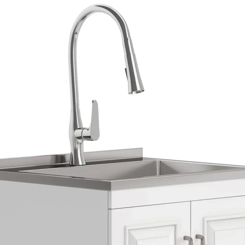 - Extra deep 20 gauge welded stainless steel sink, High arch single lever faucet with on and off spray