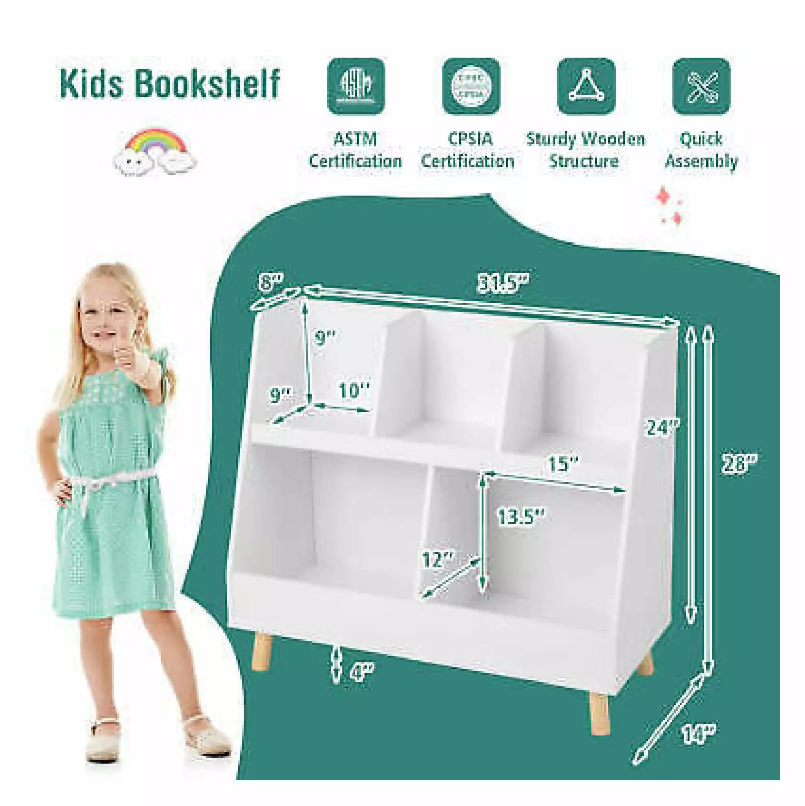 Color: White Material: MDF. Solid Wood Overall Dimension: 31.5 x 14 x 28 (L x W x H) Size of Each Upper Cube: 10 x 9 x 9 (L x W x H) Size of Each Lower Cube: 15 x 12 x 13.5 (L x W x H) Height off the Ground: 4 Overall Load Capacity: 68 lbs Net Weight: 27.5 lbs Package Includes: 1 x Kids Bookshelf 1 x User PRODUCT DETAILS: Description:Tired of a messy room The 2-in-1 bookshelf & toy chest will be a great solution! It features a multi-cube design for classified storage. which is ample to store books. toys. decorations. etc. Plus. overall surface is burr- & each corner is rounded. so kids won’t be accidentally scratched. Thanks to 4 solid wood legs & anti-tipping kits. the toy chest is super stable. 4 off the floor. the kids bookshelf will stay away from ground dust. More . the open bookshelf is 28 tall. perfect for kids to see & get wanted books & toys. Being placed in the playroom. nursery & bedroom. children’s reading & organization abilities will be highly improved in the long term. Finally. the whole assembly is very simple. It will be a perfect present for kids. Features:Cleverly combines a bookshelf & a toy chest A kid-friendly height of 28 for easy access Up to 5 cubes to offer classified storage High stability is ensured by anti-tipping kits to the wall Sturdy wooden structure ensures strong support 4 solid wood legs are elevated to keep away from ground dust Round corners & smooth edges for safe touching Anti-falling edges keep items in place Cultivate good reading habits and keep toys organized Works well in the reading room. bedroom. playroom. kindergarten and more Waterproof surface for easy cleaning Quick assembly guided by a thoughtful manual Equipped with certification & CPSIA certification Specifications:Color: White Material: MDF. Solid Wood Overall Dimension: 31.5 x 14 x 28 (L x W x H) Size of Each Upper Cube: 10 x 9 x 9 (L x W x H) Size of Each Lower Cube: 15 x 12 x 13.5 (L x W x H) Height off the Ground: 4 Overall Load Capacity: 68 lbs Net Weight: 27.5 lbs Package Includes: 1 x Kids Bookshelf 1 x User Contact & Returns: If you have questions about purchases from us contact us through Walmart’s Message Center. Items should be returned in their original product packaging and all accessories in shipment must be included if you would return the item. Shippment: Standard