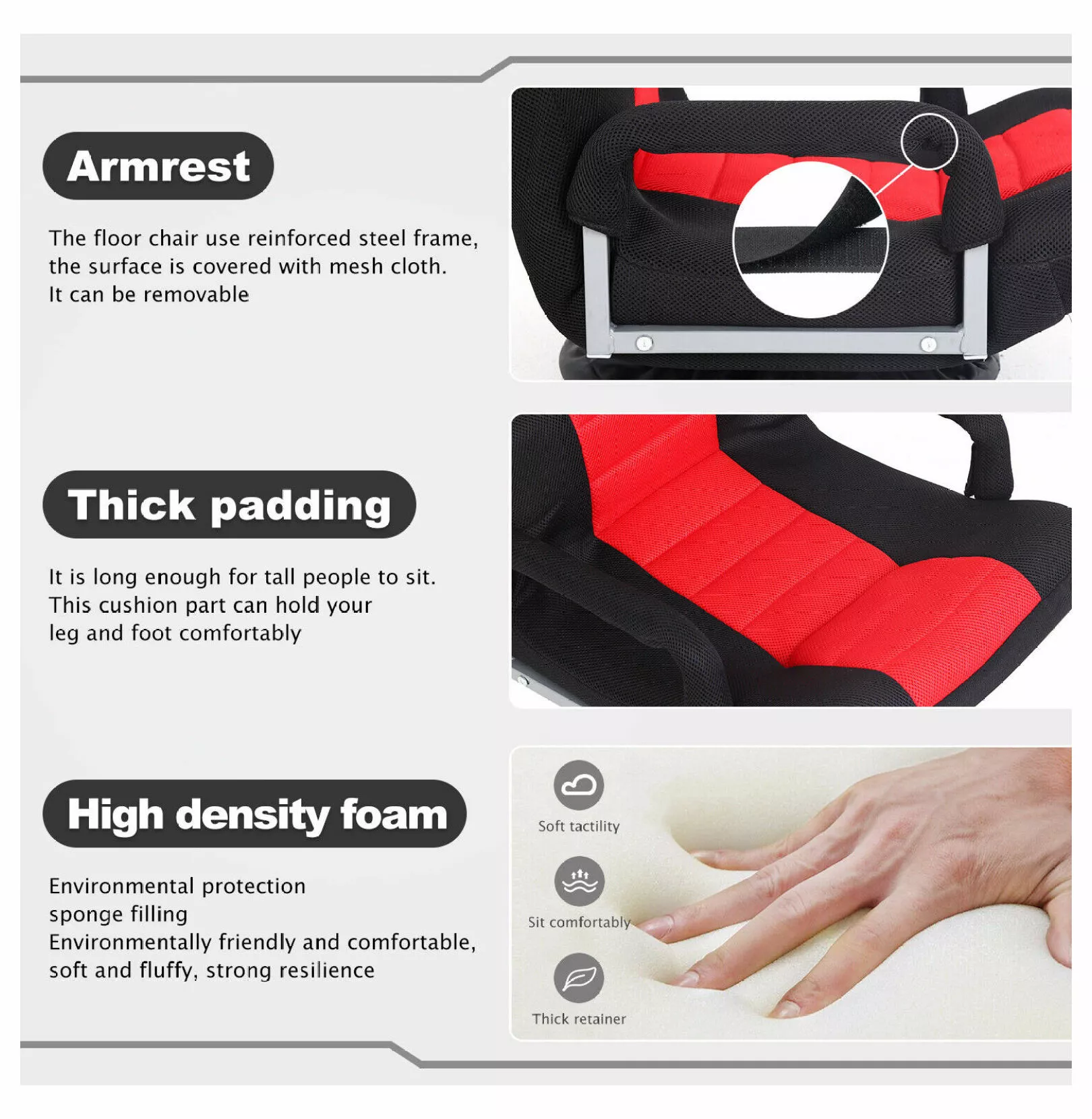 Multi-scenario Requirements – Our floor chairs can meet the needs of multiple scenes. Including bedroom. balcony. computer room. and outdoor. you can read on the floor chair with back support. floor gaming chair. entertainment. rest Foldable Design – This floor chair provides you with comfortable leisure and entertainment. And give you everything you need for the gaming chair floor. but also convenient for your storage. and when you do not use his back can be folded up the floor gaming chair. need a small space can be placed. will not occupy your space. 360 Degree Rotation Design – For added fun and more convenience. we add 360**swivel base brings much in turning around your body. and get whatever you want on the gaming floor chair without left the floor chair. 5-Position Adjustment – Adjustable 5-position backrest was been designed for the floor chair to fulfill different individual requirements such as gaming floor chair. Adjust thefloor chair with back support to your desired Angle with ease. Breathable Mesh &Elastic Sponge – Use breathable mesh and elastic sponge. Breathable mesh can ensure full breathing of the chair. and high-quality sponge can ensure comfortable sitting and prevent sagging. Adjustable BackrestConvenient backrest adjustment saves strength. Allows you to sit and recline.satisfies you different height. the demand of different scene. you can sit. also can recline. let you again more comfortable.360 ** RotatingEnjoy all-around mobility thanks to the steel bearings on the sturdy circular base; needs to be rotated gently and forcefully to meet the requirement of 360**.High Quality Breathable Mesh ClothMesh polyester cover fabric. very breathable.soft and high density foam .sponge wrapped breathable mesh cloth can better heat dissipation. even in hot summer. better air exchange.Comfortable Handrail DesignHigh quality steel frame. stable and firm. high durability.Make your leisure and relaxation safer.Comfortable BackrestHigh elastic sponge. thick but not deformed. soft and comfortable. According to the human body mechanics. the waist pillow design is specially designed for you. which can let you have a full rest because of the sore back of work.Strong FrameThe handrail is made of high-quality iron alloy. which makes you more comfortable and safe. Listed by Frooition Frooition | No-js Template | Walmart design. Walmart store design. Walmart shop design. Walmart template design. Walmart listing design. Walmart Listing Tool (ver:froo_no_js)California Prop 65 Warning:WARNING: This product can expose you to chemicals including Di-[2-Ethylhexyl] Phthalate. which are known to the State of California to cause cancer. and Di-[2-Ethylhexyl] Phthalate. which are known to the State of California to cause birth defects or other reproductive harm. For more information go to www.P65Warnings.ca.gov.