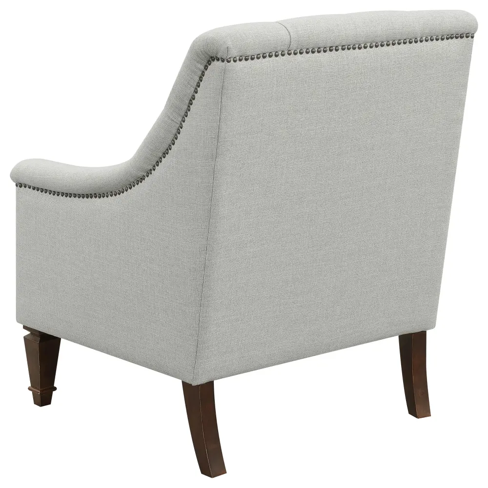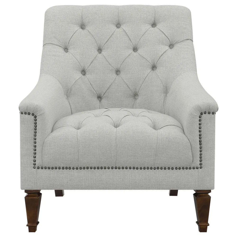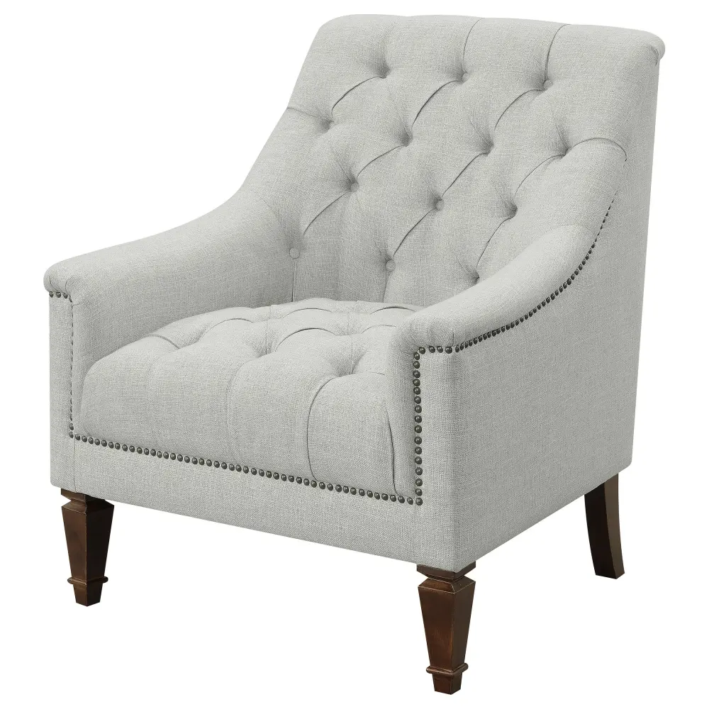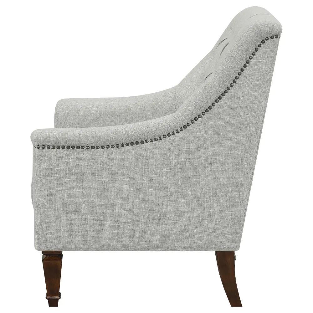 All eyes are on the romantic silhouette of this accent chair. Bolster the tasteful appeal of a transitional room with a beautiful chair with elegant contoured arms. grey upholstery brings a neutral character that blends in most settings. Tufting on its seat and seat back join ornate leg designs. Complete a sophisticated, cushiony seating group with this fabulous chair.