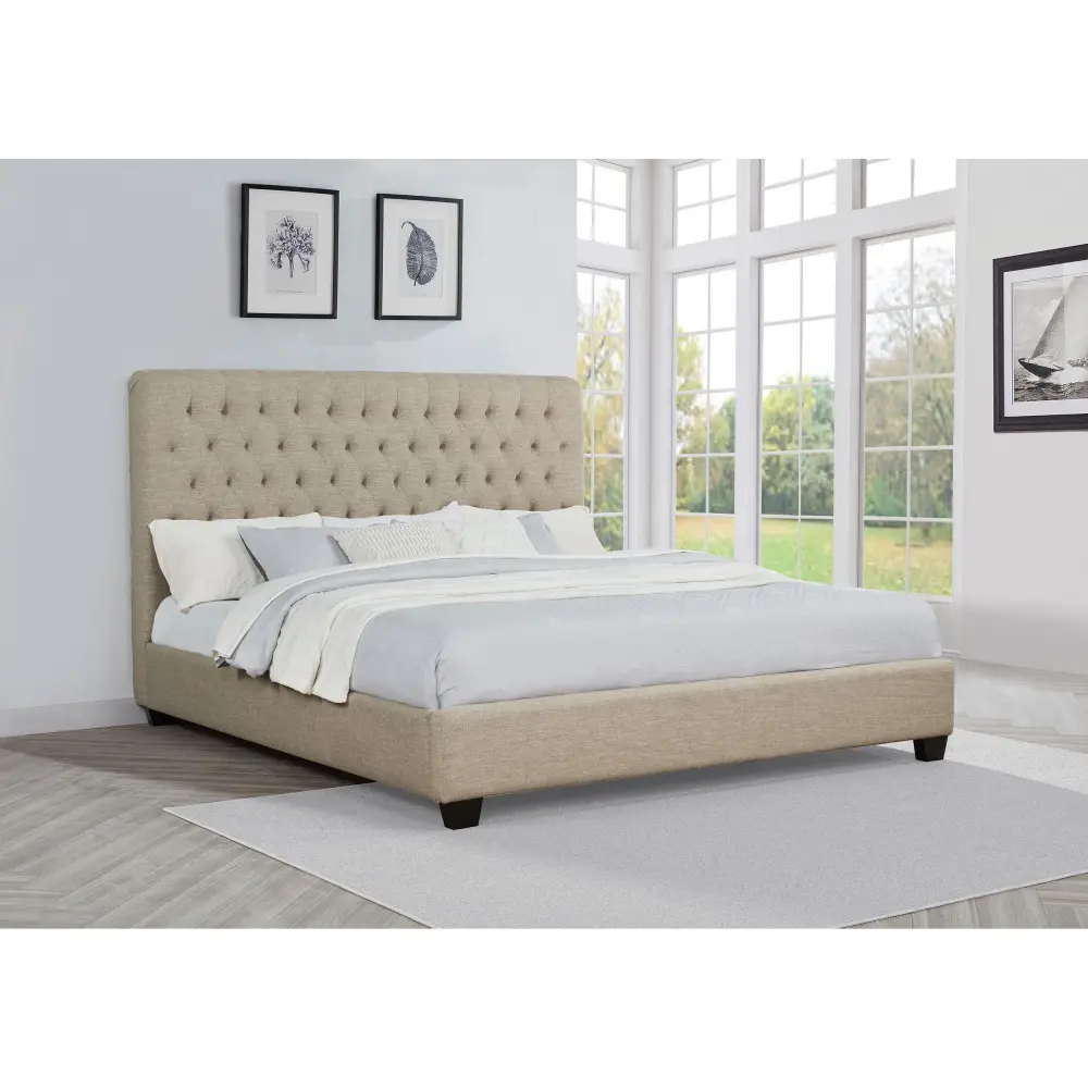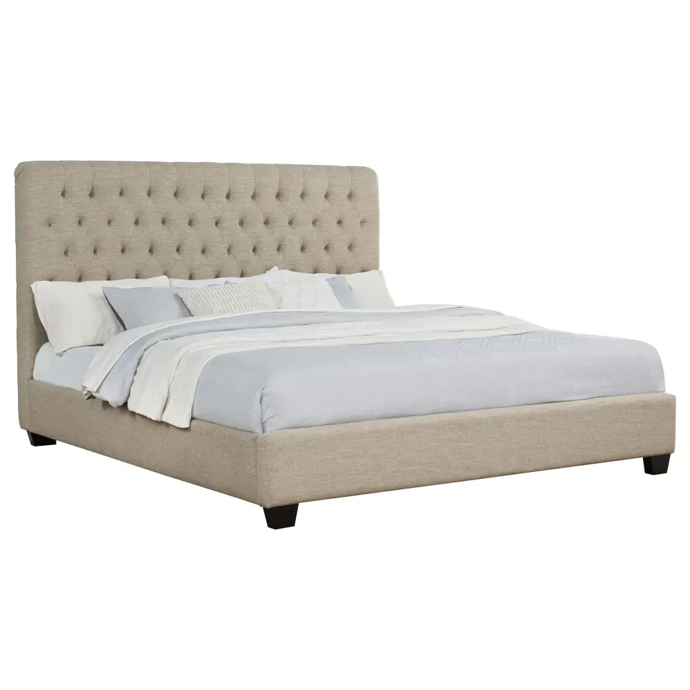 This low-slung bed combines elegant styling with a uncomplicated design that’s a gorgeous addition to the home. The high headboard has crisp lines and is beautifully accented with button tufting. No footboard gives this bed an open, appealing quality. The bed sit on short espresso legs that are a handsome complement to the bed design. This bed brings an understated timeless design to the bedroom.