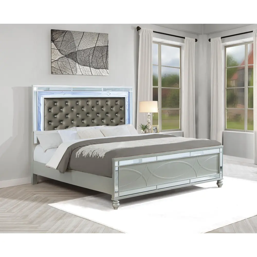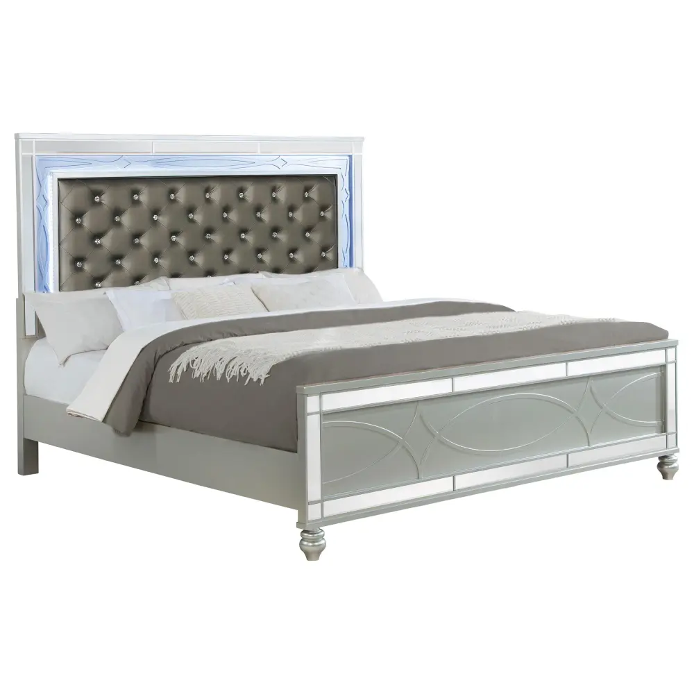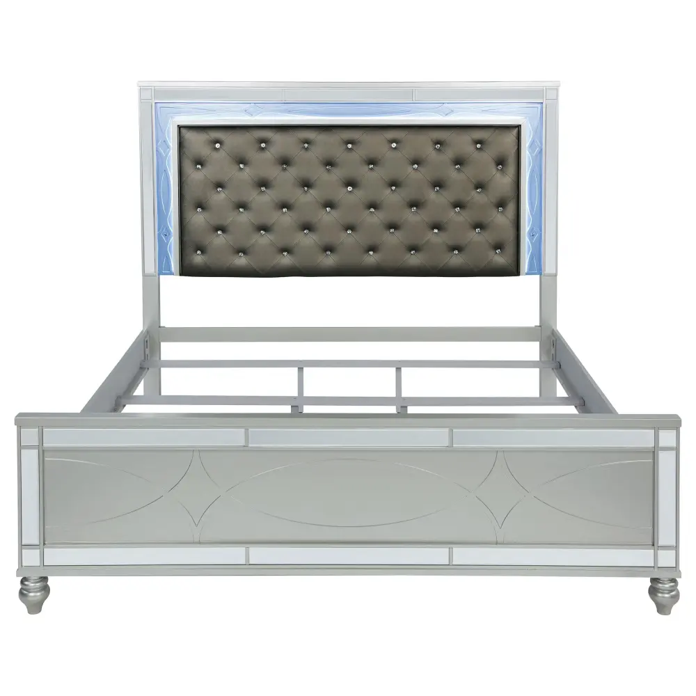 This glamorous contemporary bed features a variety of features that make it a must-have in any current home. This exclusive Coaster design comes in a shimmering silver metallic finish that enlivens any space. The imposing headboard is upholstered with metallic leatherette that’s fully tufted with crystal buttons. The headboard also includes white LED touch lighting so you can enjoy a vibrant ambiance. Unpatterned block legs on the headboard and exquisite bun feet on the fret work detailed footboard come together to finalize the style of this fabulous bed.