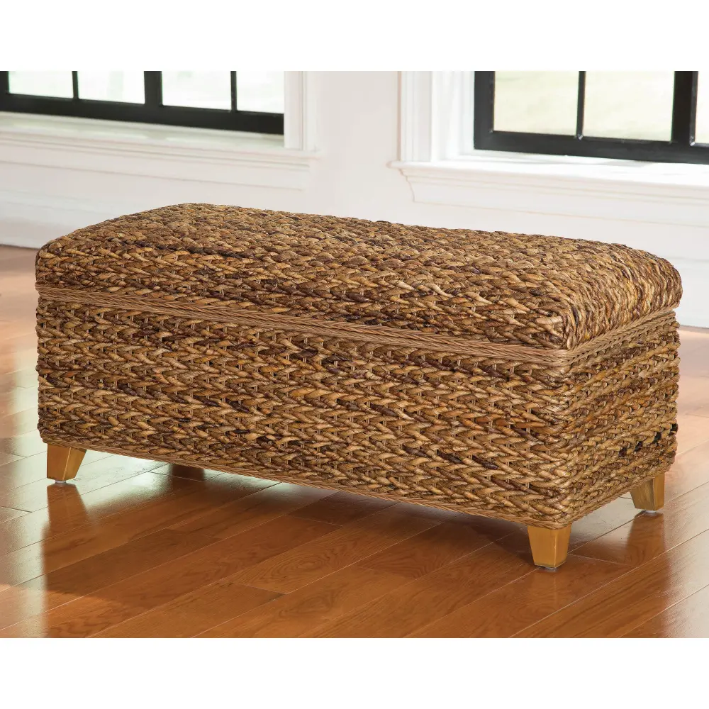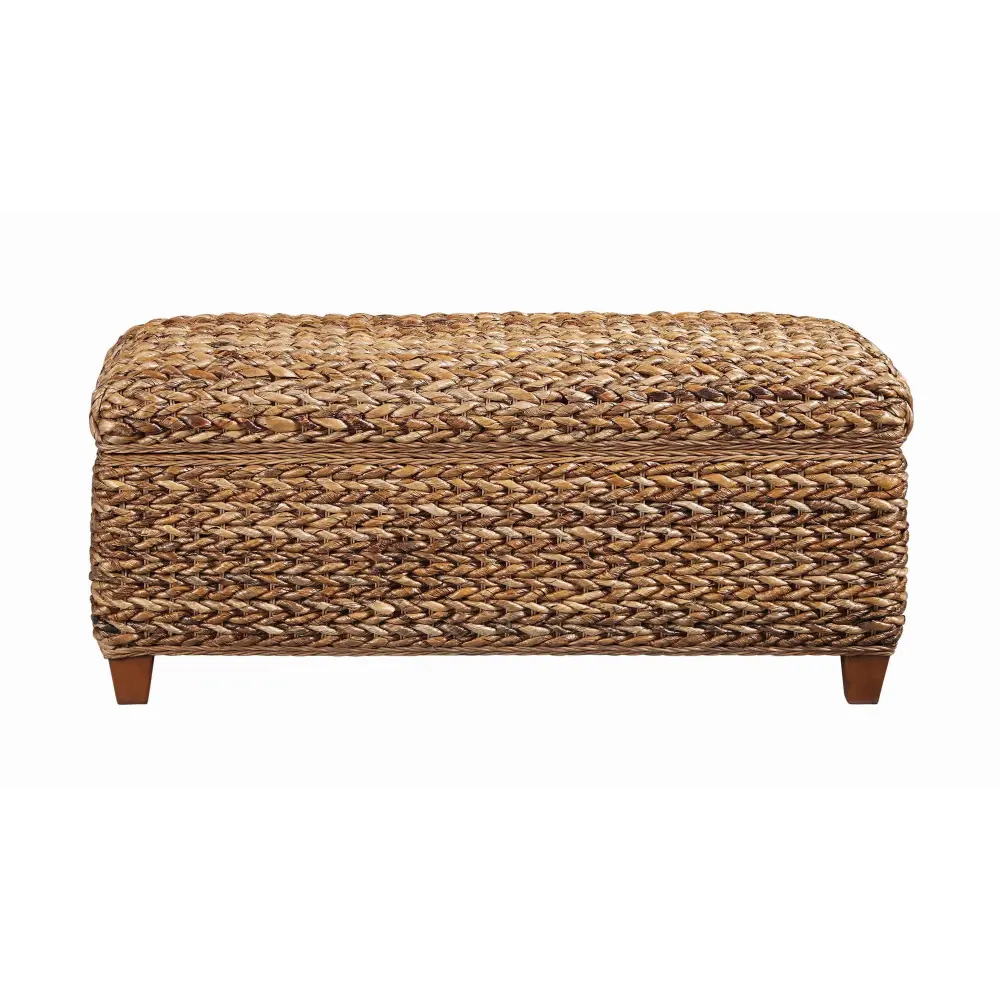 This trunk from the Laughton collection is proof that a trunk can be stylish as well as practical. It’s constructed of well-built wood and select woven materials that mesh well together. Finished with an amber-colored touch, it goes well with other rustic decor. Lid opens to spacious storage that accommodates everything from a comforter to old leather-bound novels. This banana leaf trunk conveys a modern country style that’s sure to please.