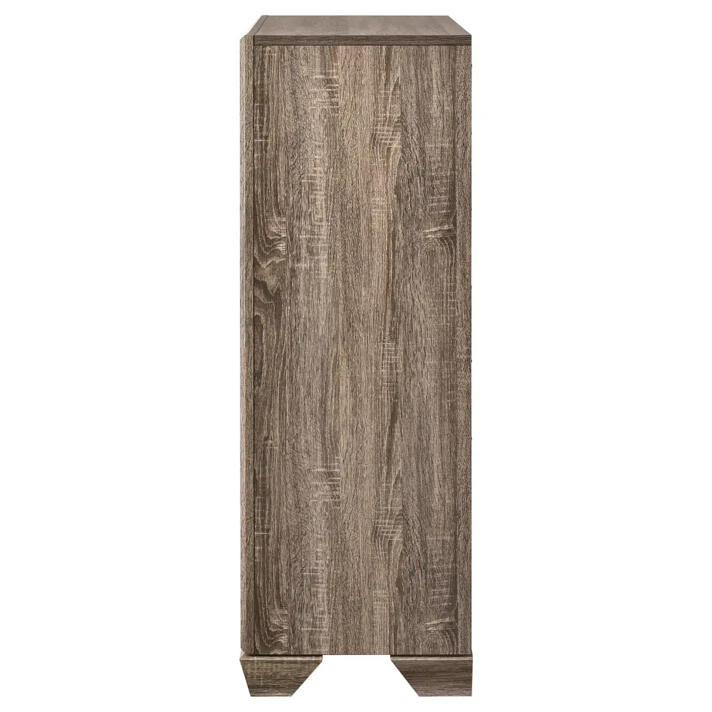 Mid-century modern-inspired, the silhouette of this five-drawer chest adds a retro feel to a contemporary space. Radiate sophistication with a washed taupe finish that highlights a stunning exposed wood grain. Refined and trendy, delicately tapered legs combine with metallic drawer pulls. Emphasize the warm hues and variations in the natural oak with the glossy and sleek edges. Add contrast with black recessed grooves around picture framed case drawer fronts.